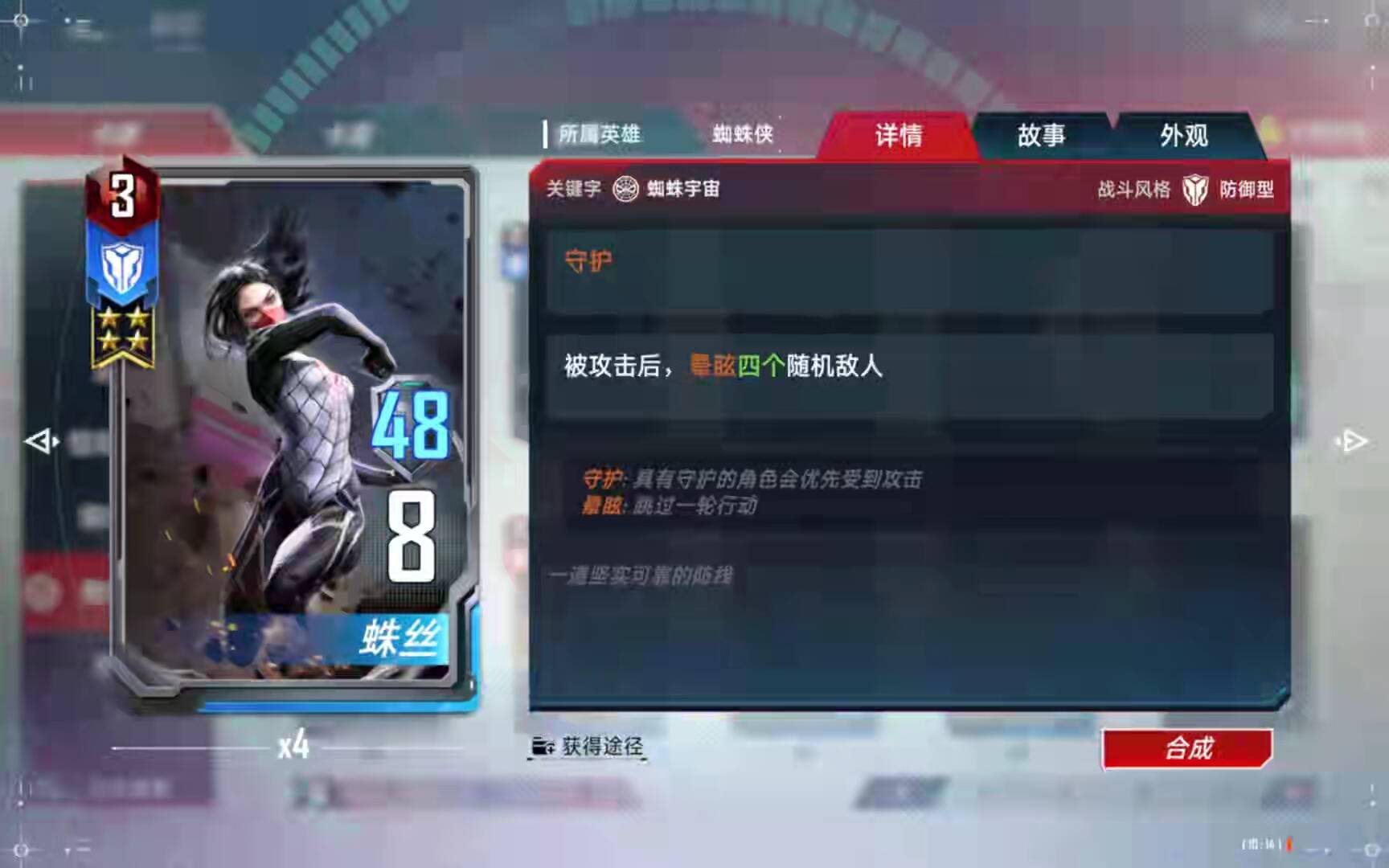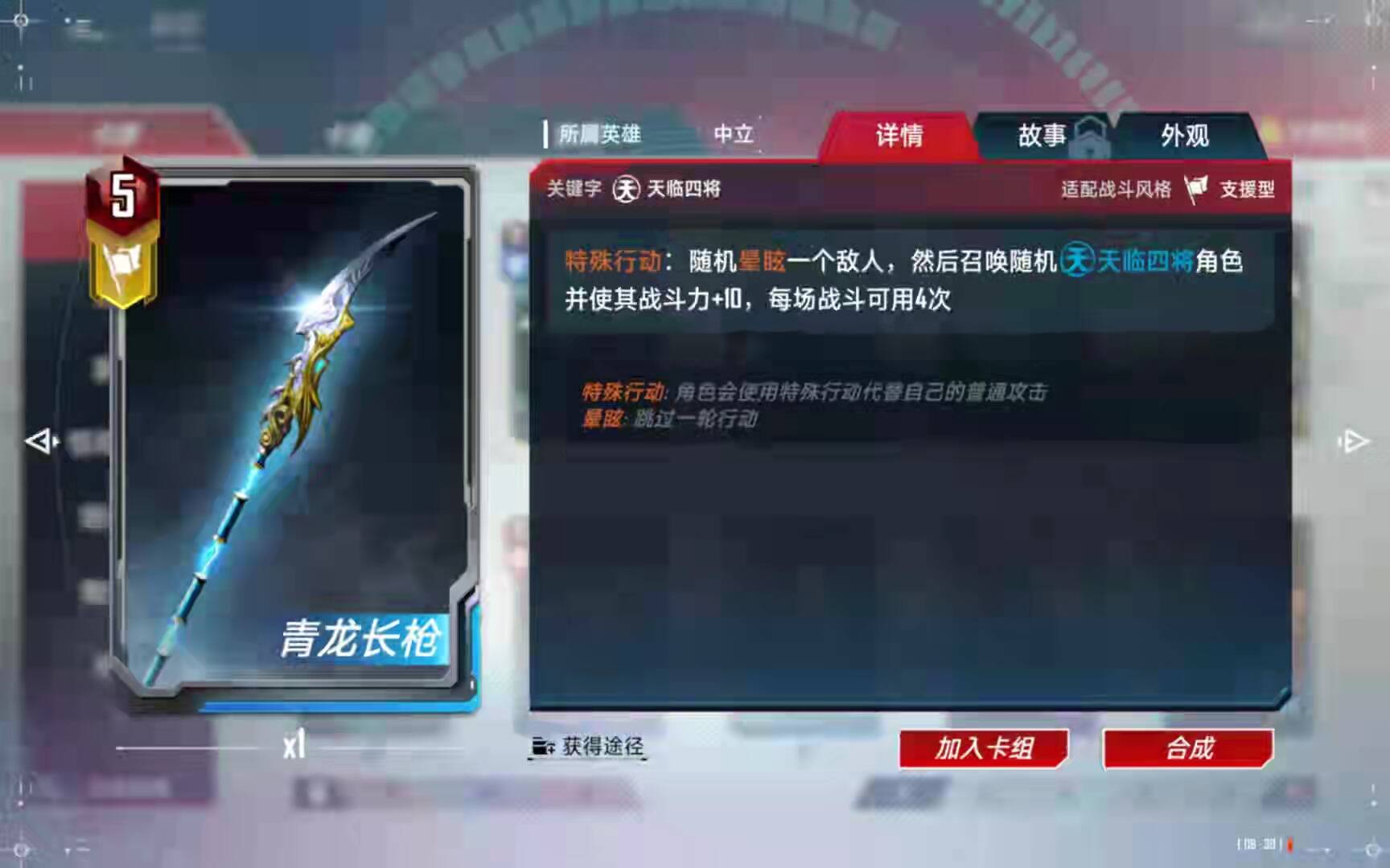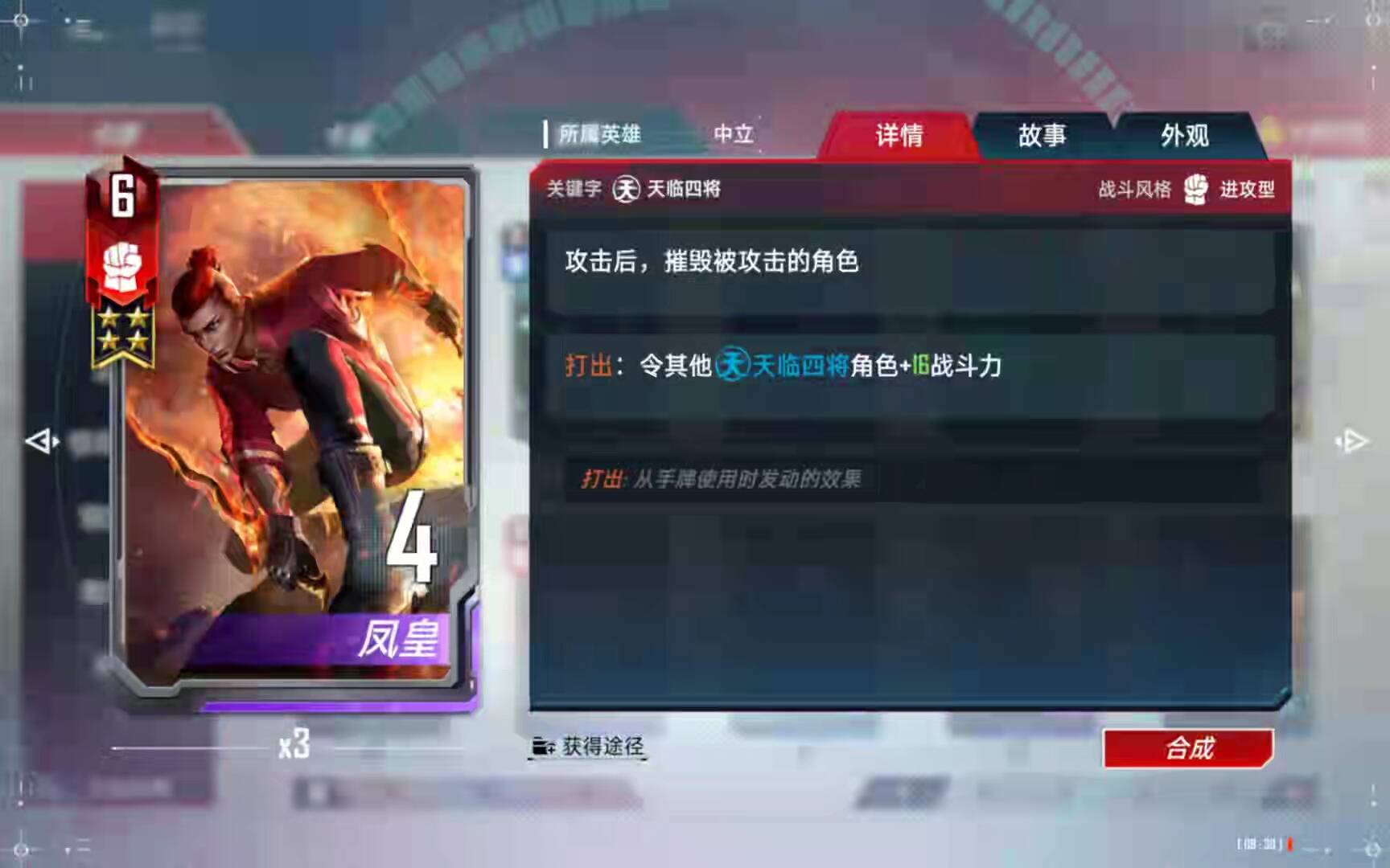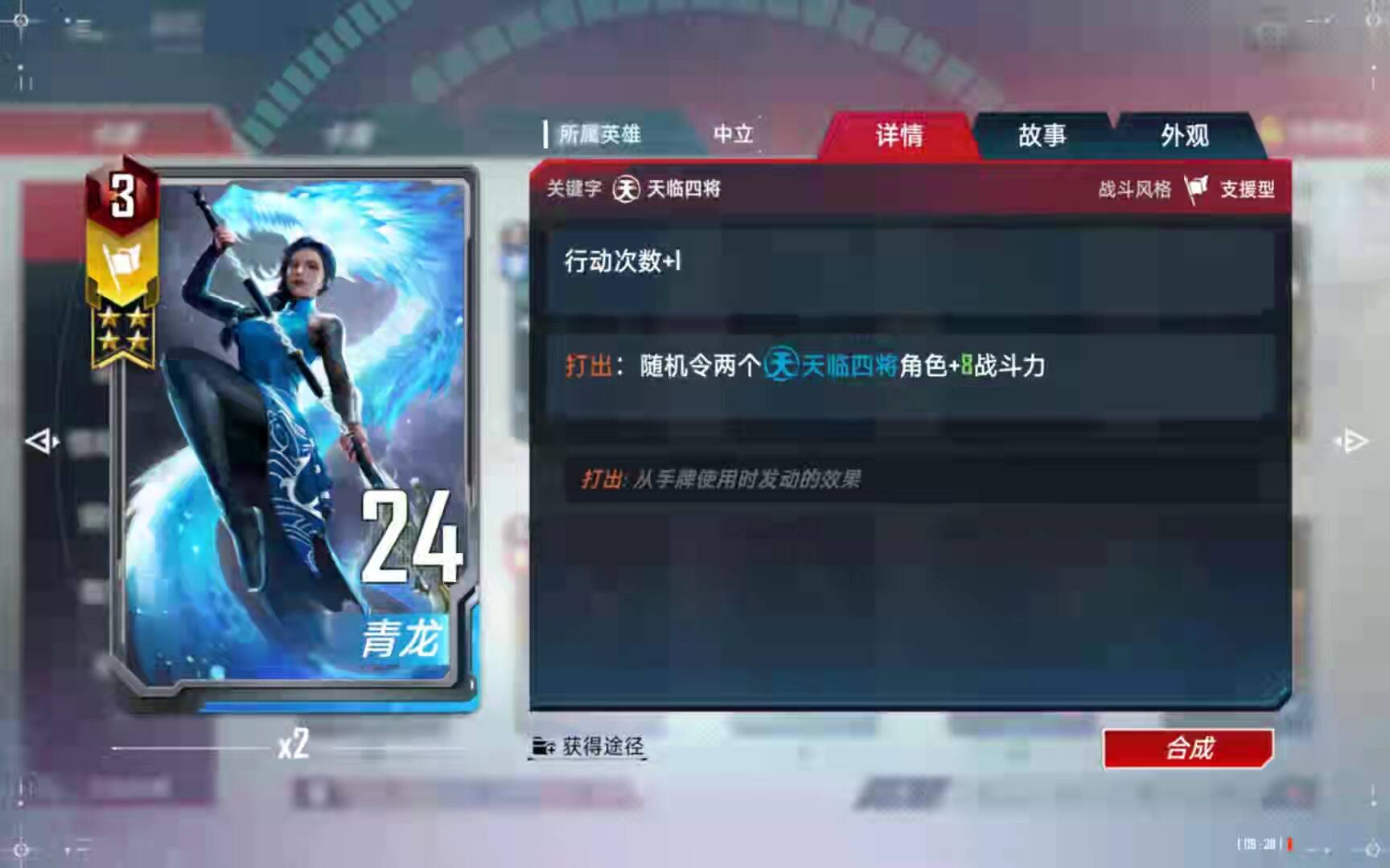 [4]、正义感召优先找合成四星的卡牌,然后找战虎,最后再考虑其他的天空单位,最后再考虑蛛丝。