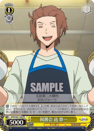 自:这张卡的战斗对手倒置时,你可以将这张卡变为回忆。变为回忆了的话,下一个己方的抽卡阶段开始时,你选择1张己方的回忆区的“祝勝会 迅 悠一”放置到舞台的任意位置。