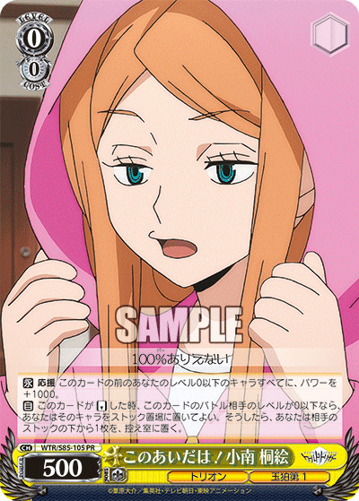 自:这张卡倒置时,这张卡的战斗对手的等级在0以下的话,你可以将那个角色放置到库存区。放置了的话,你将对手的库存底1张卡放置到休息室。