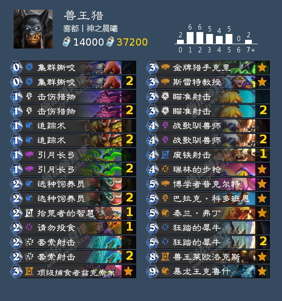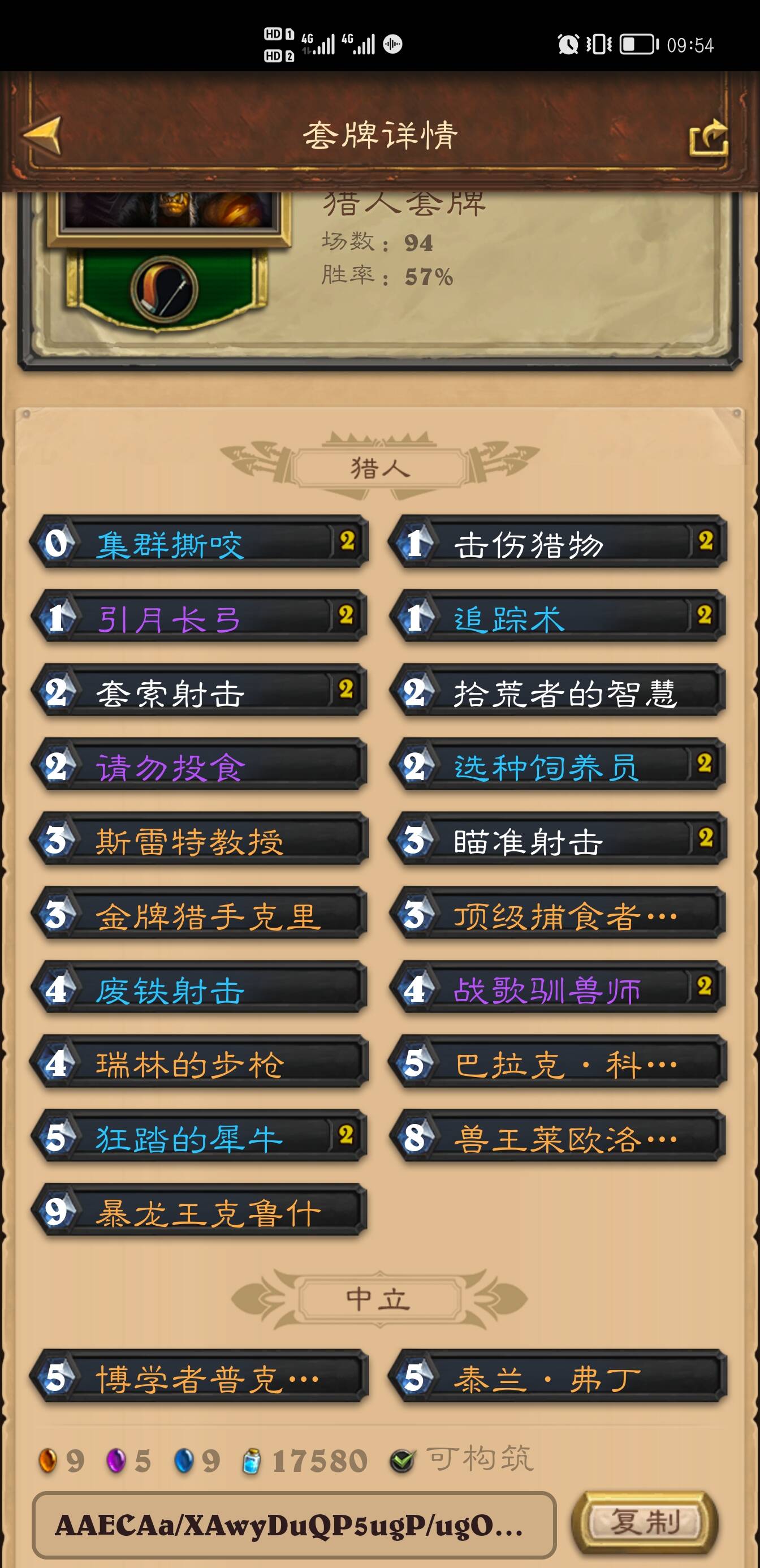 我从9月12日起使用兽王猎卡组,都对每一张卡认真思考和审视,最终得到这个版本。与牛牛猎相比,斩杀更高、更能出其不意。与T7猎、暗牧相比,抢血能力不足,但是爆发极高但更贵啊。