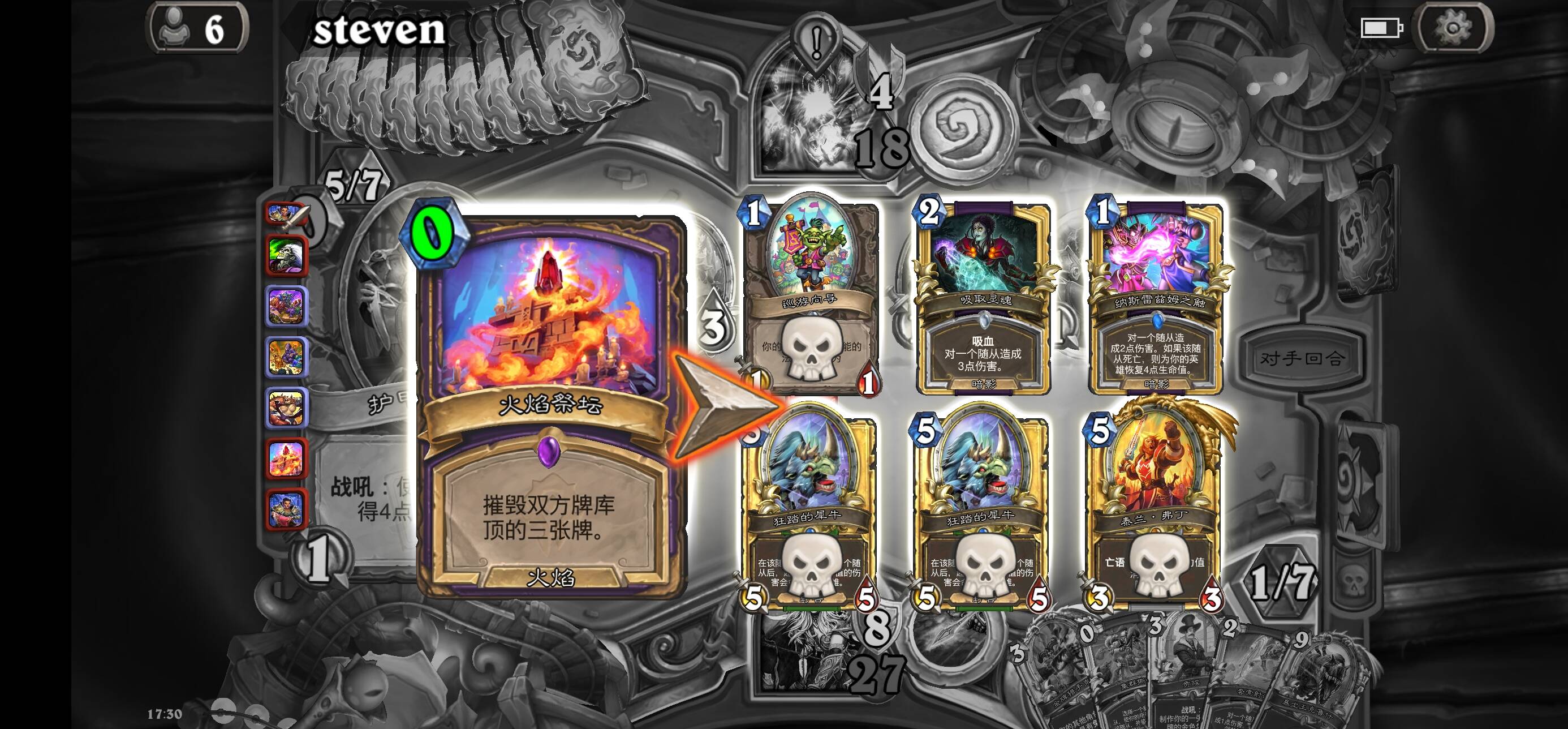 对阵情况:起手找选种饲养员,这个太重要了。当前术士恢复力极强,一击不死就很难打死了。所以我们要尽量多的暴龙王克鲁什冲脸来得到胜利。尽量少下或者不下随从,减缓术士做任务进度。狂踏的犀牛这里发挥并不好,因为我们buff手段并不多,也没带逃脱的恐惧卫士,会玩的术士也会自己下随从然后法术解掉。千万不能卖斯特雷教授和锁套射击,是解巨人的利器。这对局泰兰·佛丁就比博学者更为优秀,博学者普特尔特要慎重打出,火焰祭坛会让你想哭。