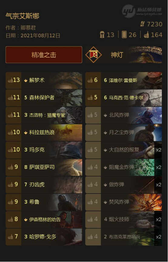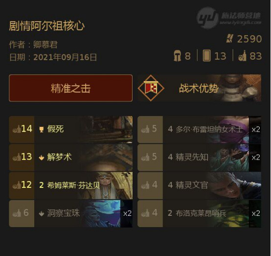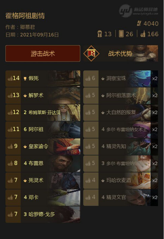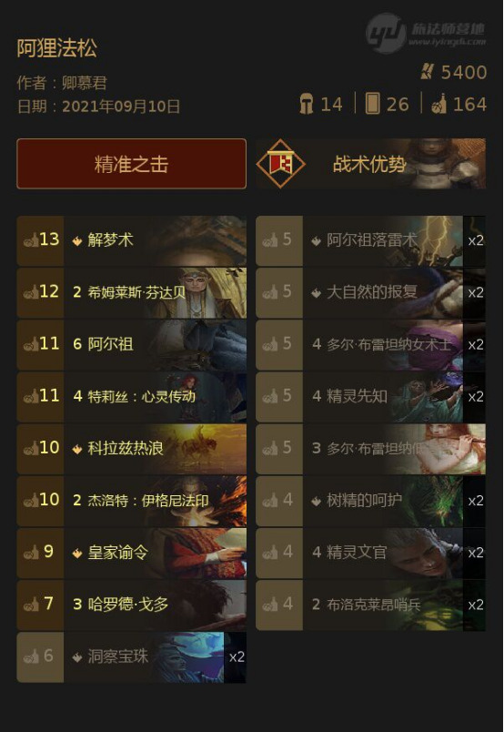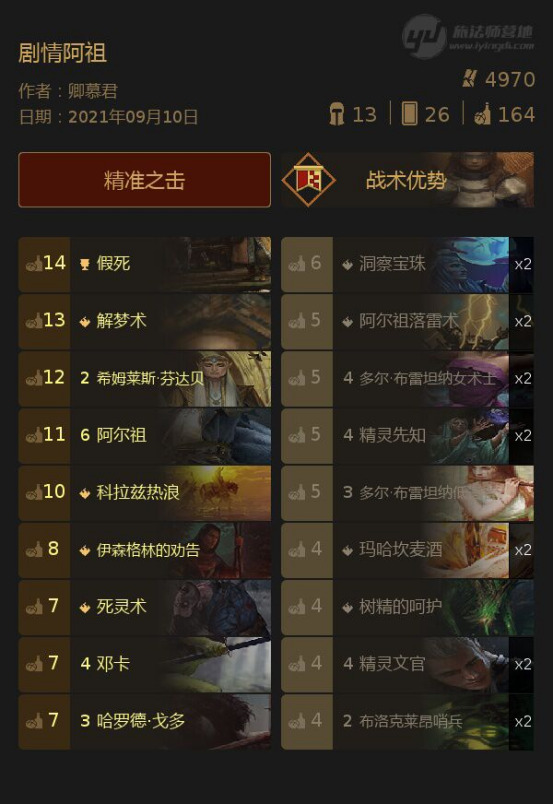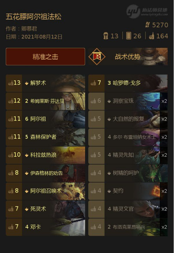 五花膘的绝活阿尔祖松,这套牌与其他法松的区别是让卡组运行更稳定的三张检索与死灵术这一让卡组展开更为灵活的法术牌。在墓地里有精灵先知和倒数1点洞察宝珠的情况下,死灵术复活精灵先知能打出12点高节奏并在墓地存下一个洞察宝珠,这使得阿尔祖这套牌对岳父拉出双球的要求没有那么高,可以通过r1,r2手打球以及配合女术士出球让墓地存2-3个球达到阿尔祖速读的效果,从而岳父拿来打一个高爆发,具体各对局打法在八月月报中有详细解读。