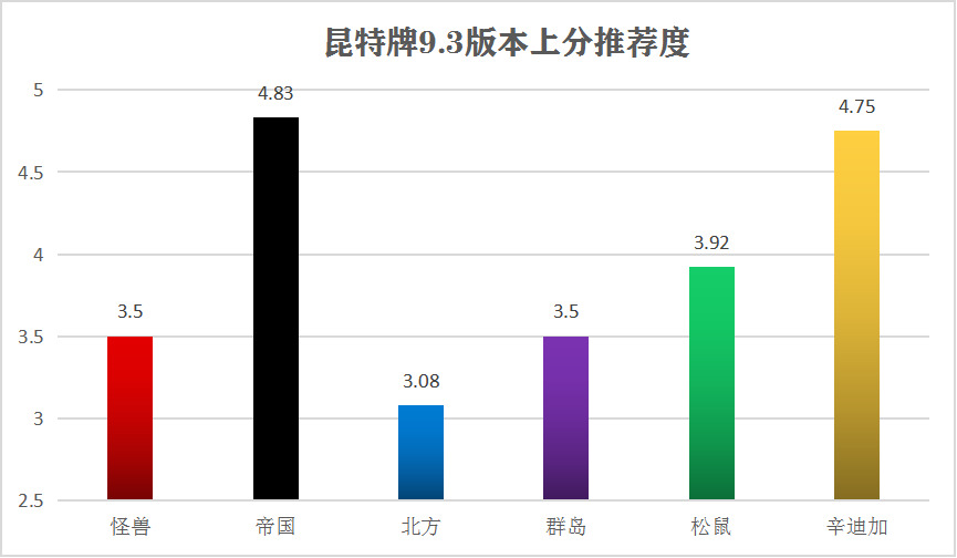 9.3并没有针对帝国的补丁,所以帝国的卡组还是维持上版本的形态:自上版本初就热度很高的同化与后起之秀揭示。强度方面,帝国作为这个版本当之无愧的第一阵营,同化和揭示在当前环境中还是有一定统治力的,我和五花膘都轻松出分2500,也推荐各位作为上分的必选阵营。