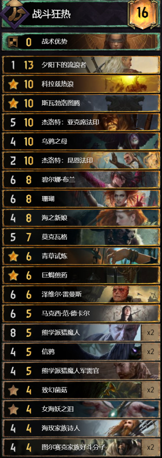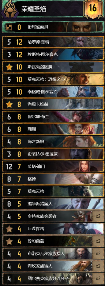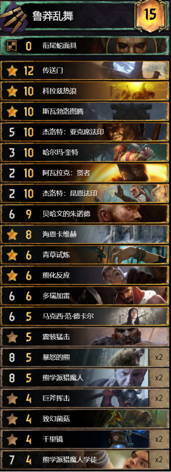 有不少人都觉得赤诚霜是个有潜力可挖的卡组,因为配合领袖,它的点数足够大,后手的情况下诸界之门和冬之女王在r1合适的时机打出来有较大的概率可以达成平卡,奥贝伦、玛姆纳则可以保证较强的短局能力,加强之后的伊勒瑞斯配合霜也有高节奏+过牌的能力,非常超模。但这套卡组比较大的问题依然是霜在短局当中无法打出应有收益,先手的情况下在不交出诸界之门和冬之女王难以拿下,长局能力在对阵目前天梯上大多数卡组都占不到便宜。