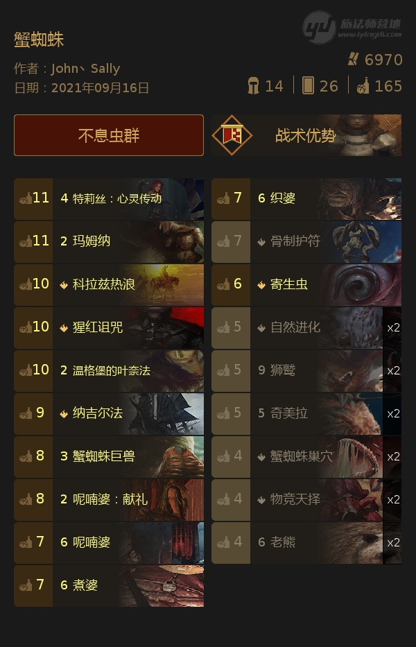残物怪兽在新版本遭到了重创,猩红夫人、玛姆纳以及卡兰希尔的调整让这三张核心卡无法产生联动,遭到削弱的猩红夫人在天梯上鲜有人问津,卡兰希尔则是在特定构筑中才会出现(如科斯切伊、米卢纳、齐齐摩女王、瘟疫妖女等都是可能的目标),而玛姆纳依然是怪兽卡组不二的选择,强大的爆点是怪兽短局的保证。上赛季横扫天梯的蛆妈在这个版本销声匿迹。但有趣的是怪兽阵营热度不减,依然排在了6阵营的第2位。一家独大的局面得到了改善之后,天梯上也多了一些怪兽的新面孔,例如蟹蜘蛛、赤诚霜怪在这个版本的出场率大幅度提升,这些改变也是我们乐于看到的,接下来给大家介绍一下这个赛季我在天梯当中尝试过的四套怪兽卡组,强度有高有低,喜欢怪兽的玩家可以酌情挑选。
