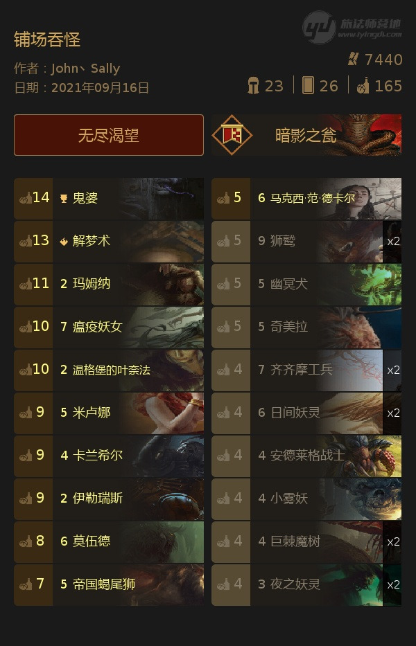 铺场吞怪是我本赛季尝试的第一套卡组,因为瘟疫女妖的降费让我觉得这套卡组应该还是很有潜力的,卡兰希尔和瘟疫女妖、米卢纳的联动都可以值回票价,瘟疫女妖配合剧情、卡兰西尔、莫伍德、叶奈法可以瞬间完成铺场并产生巨大的爆点,但同时因为这些联动,这套卡组对手牌牌序也要求比较高,所以我还是选择携带了解梦。