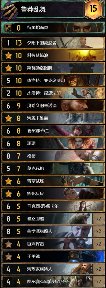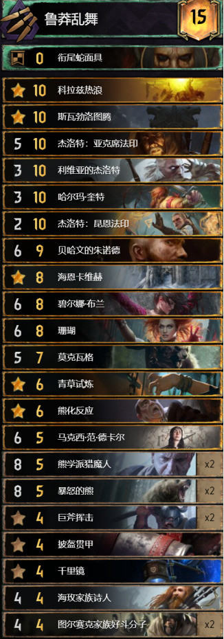 一套军事化卡组,上限取决于牌序,说白了就是抽牌水平,手牌顺起来几乎无敌。落雪配合领袖combo爆点并跳出手里的萝卜,瘟疫制造者可以在前期打出先滤一张,否则最后调度压力会很大。打松鼠时需要打四打五,舌头吃士兵;其他情况舌头吃解牌,这应该在开局就规划好从而在调度时注意换哪个。调度的优先级是把不能打的牌先换走,也就是四个揭示组件和魔像,当然威爷是可以留的。值得注意的是卫士和洗牌机的用法,不用当成宝捏着,牌序卡住了该打就打,以保证流畅度为首要目标。比较关键想抽到的牌是舌头、近卫军和落雪。卫士的作用是吃一张大解,如果站住了保住洗牌机配合落雪可以每回合两点开刷。可以学习小饿膜的视频:https://b23.tv/v5tHIj