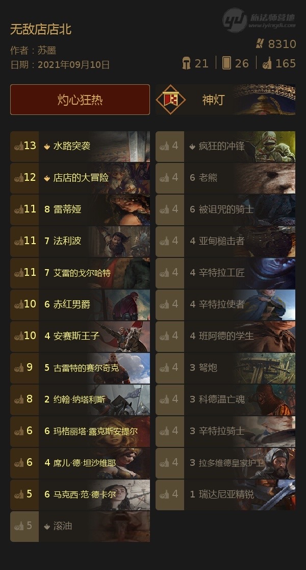 萌萌小西几(曾用名苏墨)的灼心狂热店店北。原作者用21场打到了2502分,而笔者本人也用这套卡组24场打到了2502分(目前北方胜率职天第一),说明这套卡组的适用群体还是较为广泛的,下面进行卡组分析。