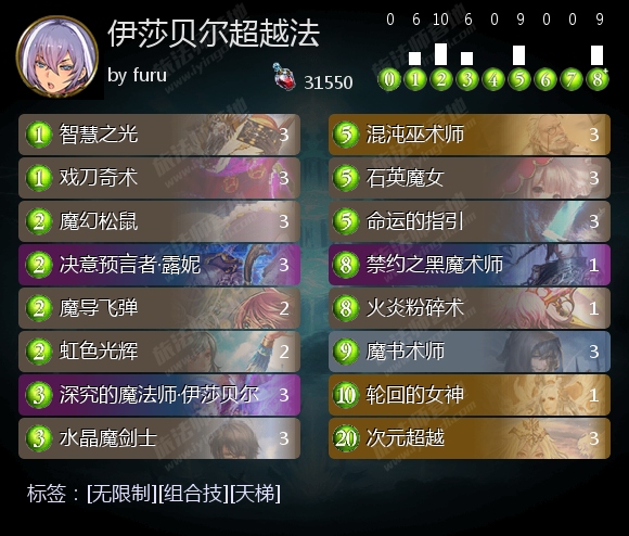 尽管在强度上略逊造物仇、疾驰法、谢幕曲死一筹,但超越法在无限天梯中的出场率堪称顶尖,特别是在收获了深究的魔法师·伊莎贝尔之后。