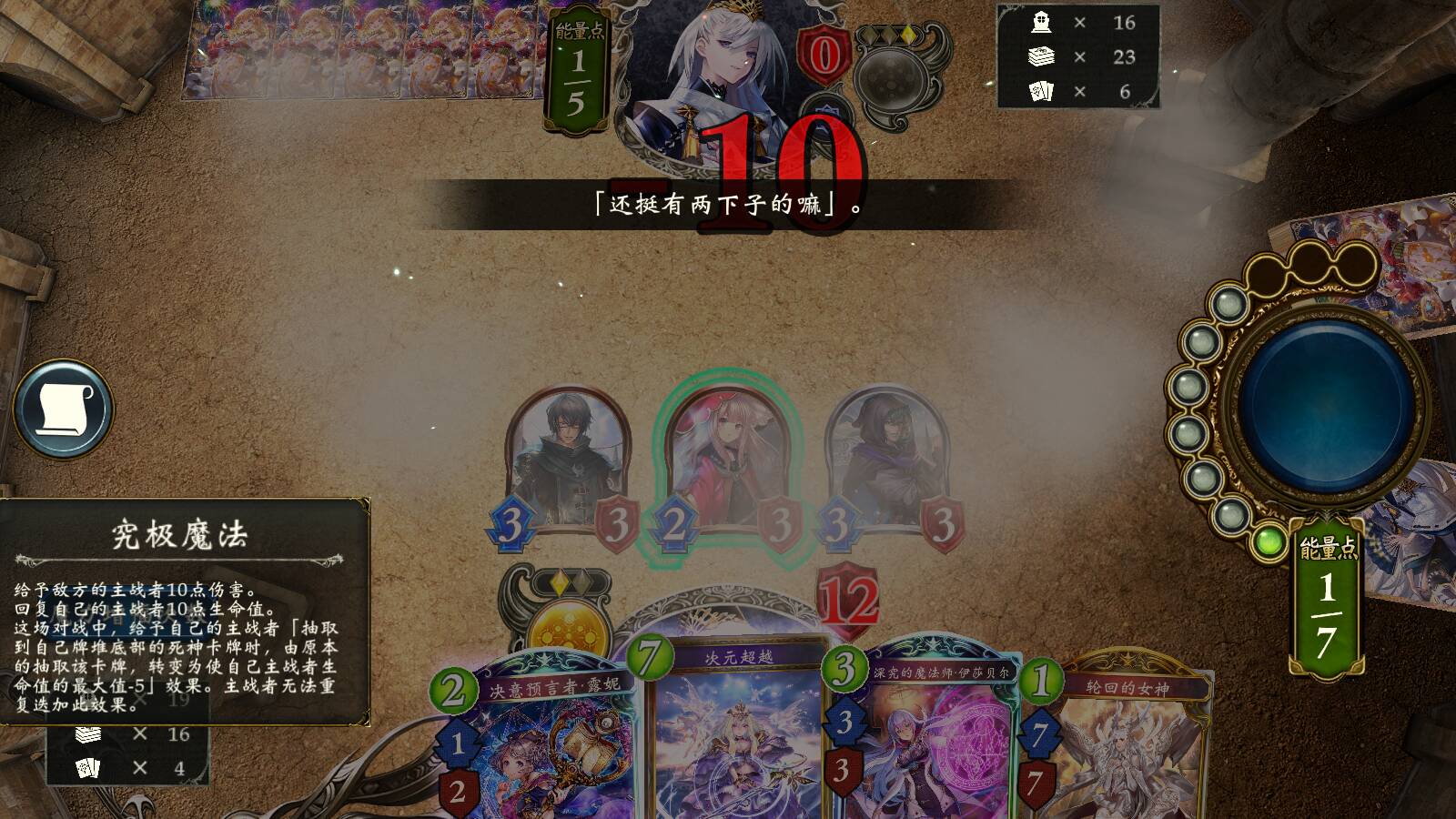 通过超越取胜。适当保留随从,配合超越斩杀。也可以通过究极魔法配合超越和少量随从取胜。