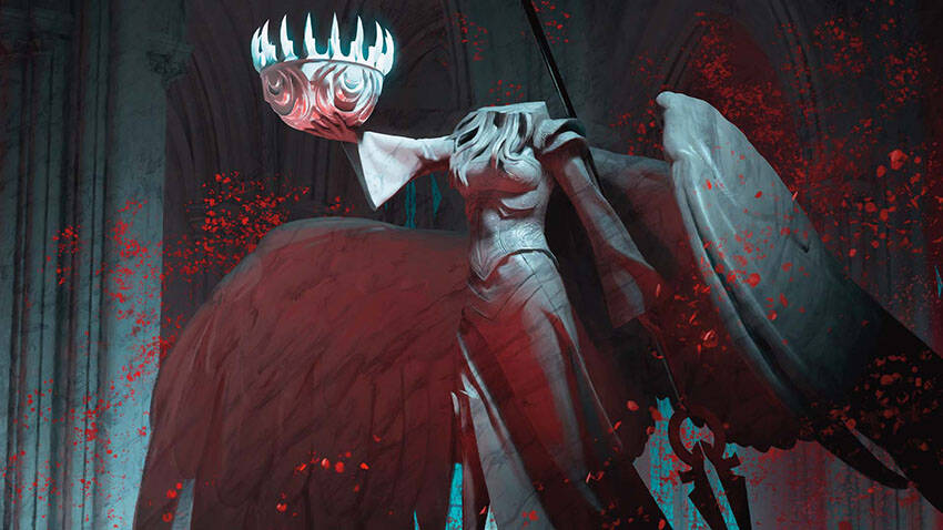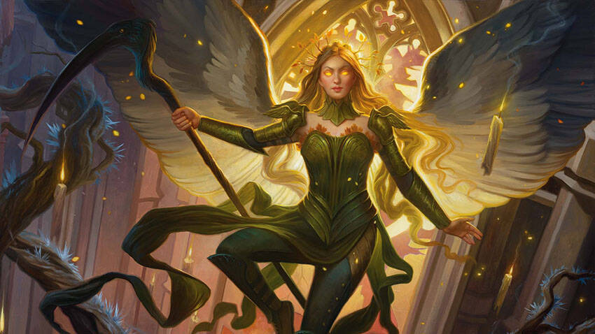但已不需要了。一根羽毛落在他们之间,散发着金色的光芒,随即出现一把苍鹭头镰刀。索霖的剑碰上这件天使武器;他勃然大怒地收手并看着这位闯入者。