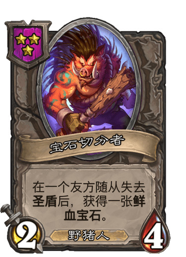 这张牌在刚出的时候我就挺看好他的,要不是补丁前不耐烦太强了,我觉得他可以算是在三本牌里最优质的几张牌了。对于机杂来说,他的价值远远超过六本的獠牙队长,因为基本上你挂着不动一回合就能拿个5-7个宝石,除了作为中前期配合飓风圣盾龙机械小狗这些牌发育发育,我觉得他更重要的是适配机杂的补位牌。机杂玩的多的同学都知道,机杂是需要一个位置来做补位牌的,这个宝石切分者就是完美的补位牌,我自己玩机杂时候经常拿他补位,然后找到一个激素拉满一回合战力。前期有发育能力,中期可以补位,后期可以打一波爆发,大家如果阵容比较靠圣盾流派,一定要记得拿这张牌。