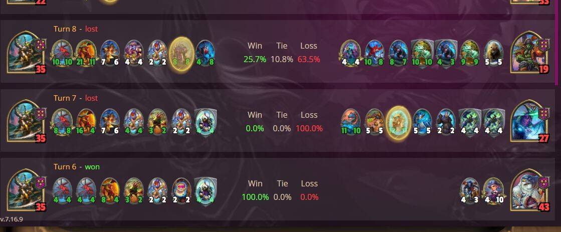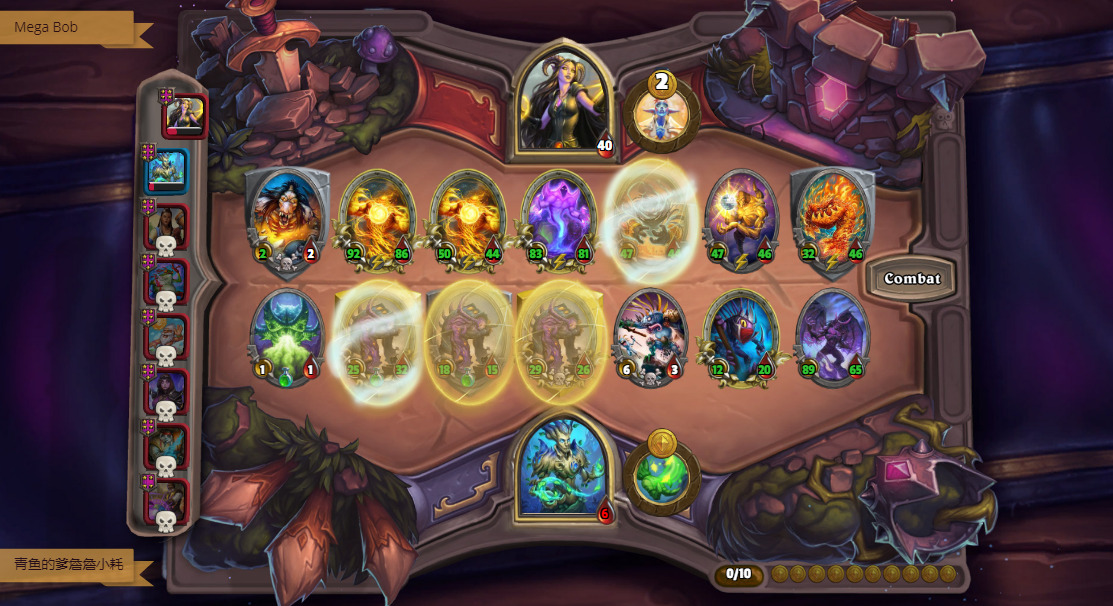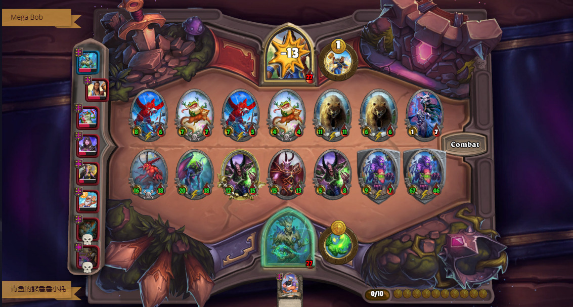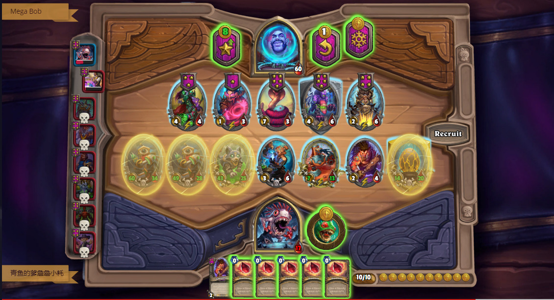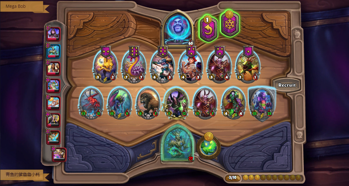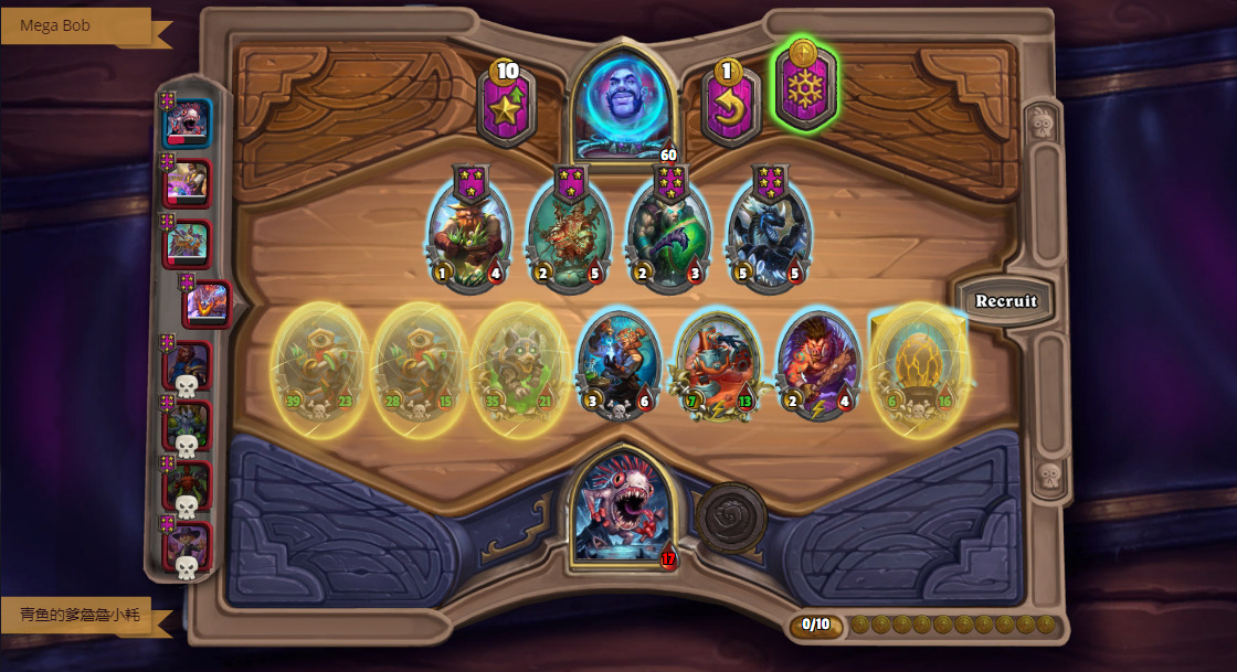 我前面一直在拿纯恶魔打架,打到这个阶段我看了一圈场上的情况基本上决定转型了,纯恶魔是没前途的(我还是个树人,在六本有无限可能)。因为这时候锤妹是个基本上毕业的跳蛙,女巴和菌菇是鱼人,泽瑞拉4本3碰的元素大概率是诺米后期元素三连肯定大的我看不懂,豪斯是5本2碰的恶魔,看上去玩纯恶魔是完全没前途的,这几家我都打不过,我这个阵容的强势期大概还有2-3回合,在这期间我应该放弃搜恶魔养后面那两个乌祖尔,想办法把阵容转成融合阵容。