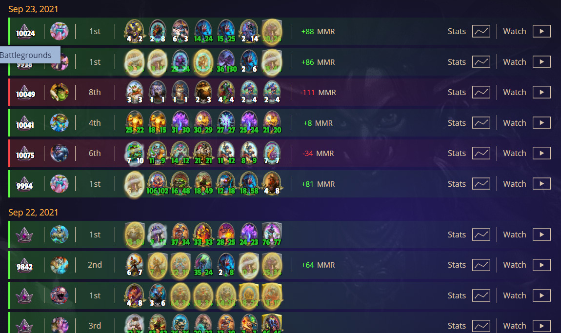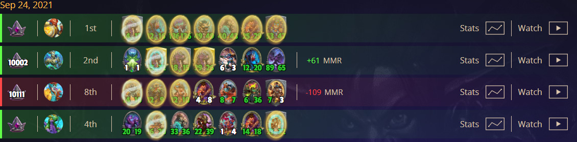 我对现在酒馆战棋的环境很满意,整体来看是比较稳定的,能玩的流派很多,补丁前我打开战棋基本上就是这个情况:先看一下种族ban选,有恶魔吗?有恶魔我就冠军打法点三了,有龙吗?有龙我就考虑玩那些有buff能力的英雄准备配合杨超越,有野兽吗?有野兽我随便打打前期随时准备跳车转跳蛙,反正玩来玩去就是这三个,上分是胡这三个,掉分是被人用这三个点名。补丁之后好了很多,我的对局体验比较丰富,除了恶魔和野兽我自己没玩过其他都玩了一遍(但我印象里我玩鱼的局是因为场上3家玩恶魔,我就去毒一下他们,所以恶魔还是可以玩的)这是我这几天玩的阵容,感觉还算的上是百花齐放的。