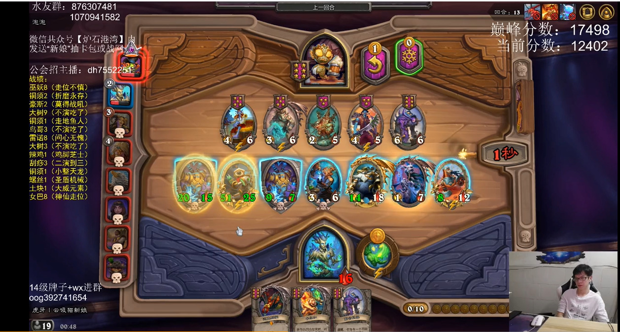 转的过程就是用3本恶魔吃掉后排的乌祖尔嘲讽藏在最后面(防被毒防被风怒一脚切),用海鲜大厨变自己场上的融合,再变酒馆里的就可以玩出7个融合的效果,然后找到军情七处鱼人开始涂毒,有铜须和发现鱼我基本上二回合就转出来了,可惜决赛对手算计了我一下,一个食尸鬼直接把我打爆了。