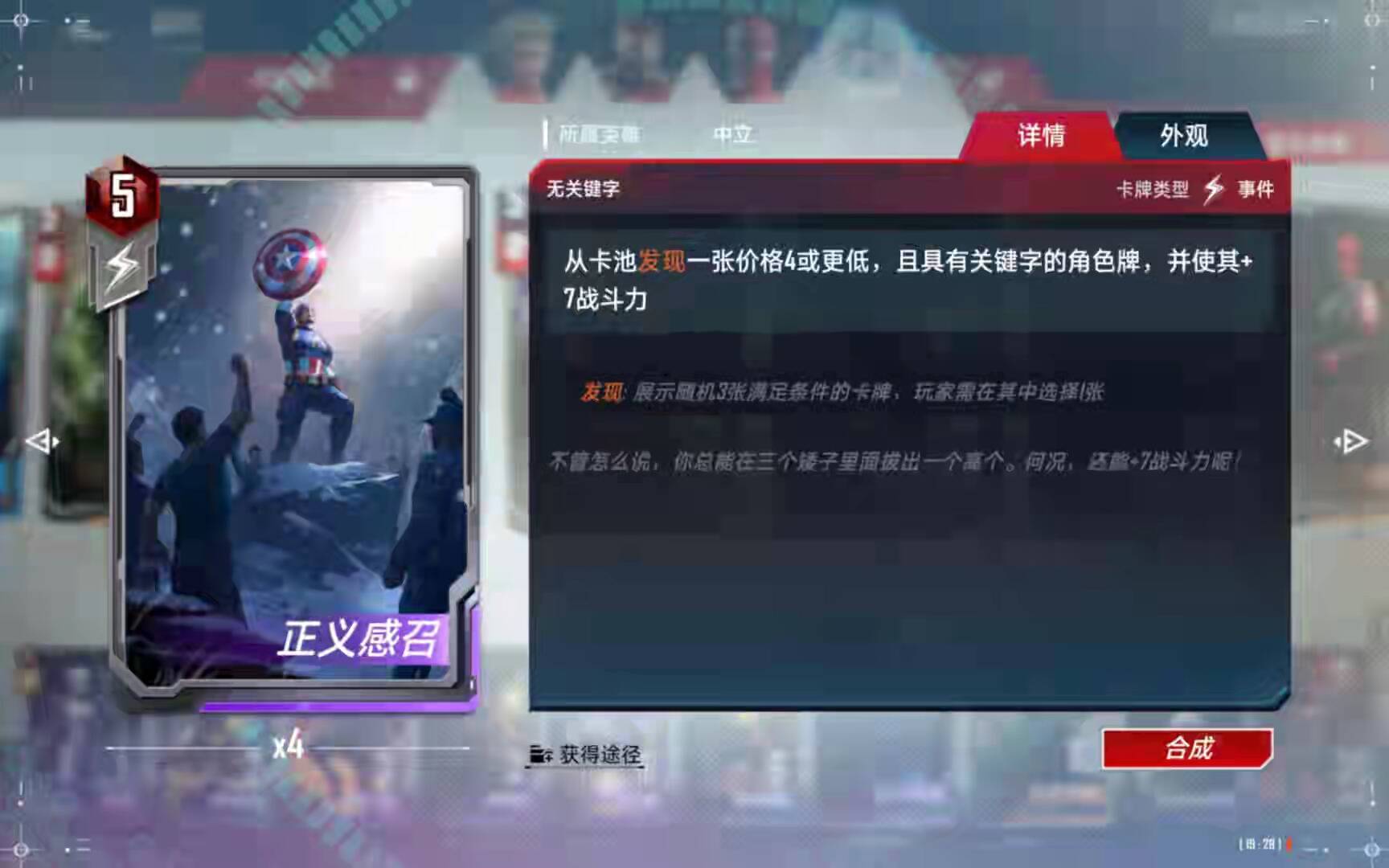 星5+钢5+艾5+中0+锁定卡池的猎鹰1种,一共有16种,本卡组4费以下“具有关键字”的“关键角色卡”有:小格鲁特、星鹰、伊戈、亚当、格鲁特五种,过滤牌库以前,正义感召找到关键卡的概率是:3*5/16,94%的概率。
