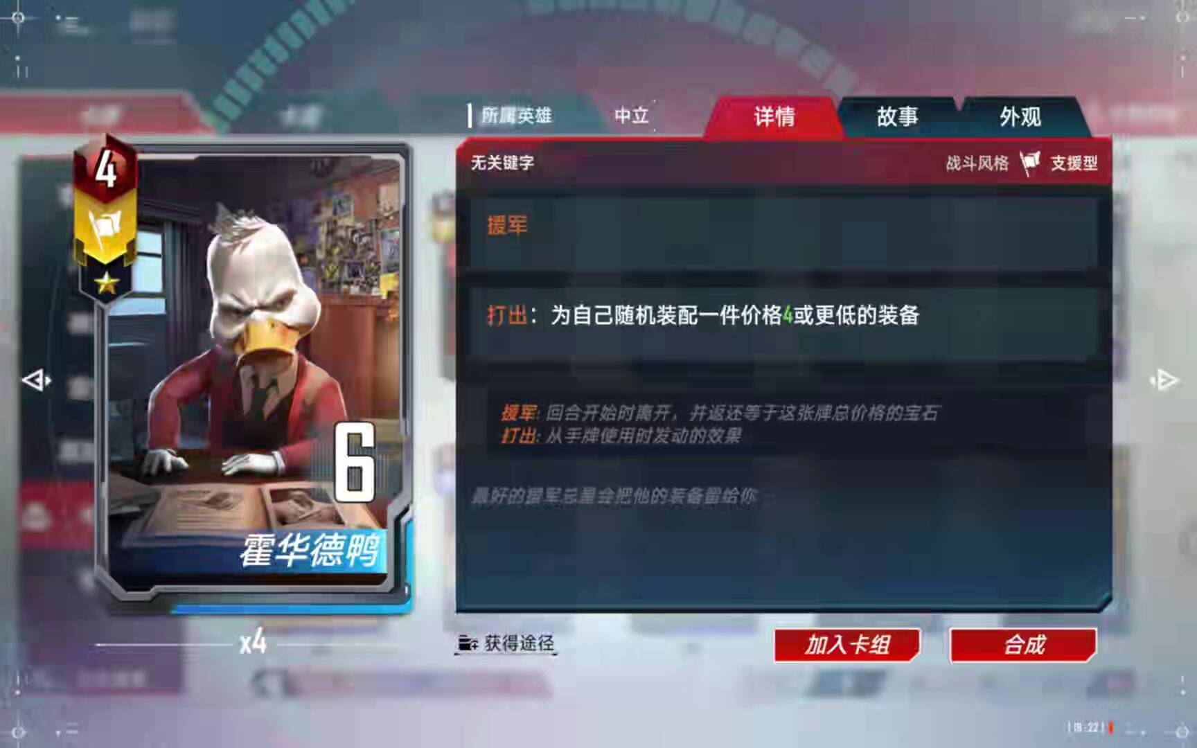 (5)援军角色,中期的时候一定要打出,可以无偿滤牌库,霍华德鸭可以白赚1宝石,还有可能直接获得本卡组的关键武器卡;