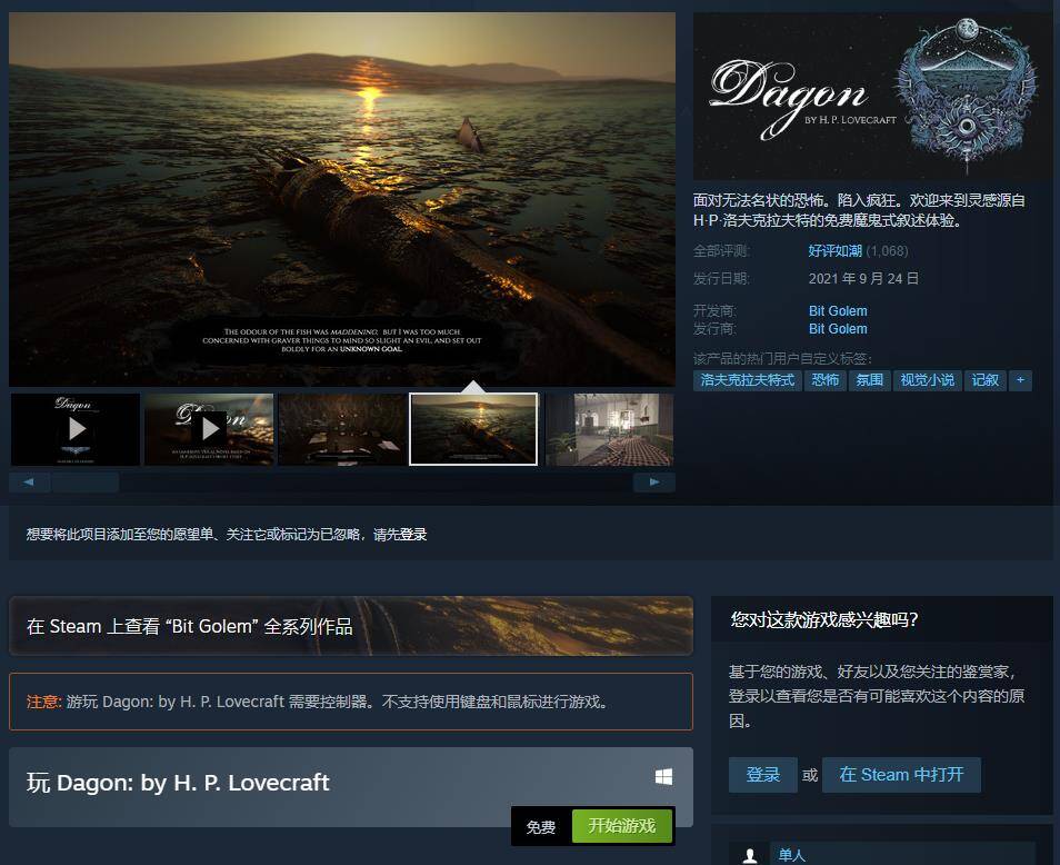 大衮(Dagon)是美国小说家霍华德·菲利普·洛夫克拉夫特所创造的克苏鲁神话中的旧日支配者之一,以它同名小说改变的游戏《Dagon》现已在Steam上免费发售,支持简体中文,获得玩家“好评如潮”评价,目前好评率为98%。在游戏中,玩家将潜入一位瘾君子的思想深渊,发掘这名曾经的船长在怪诞之岛上所遭遇的不可名状的可怕故事。