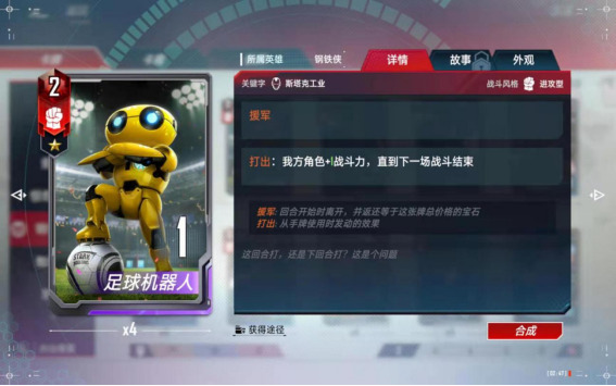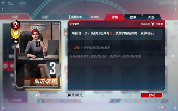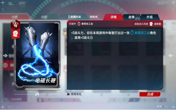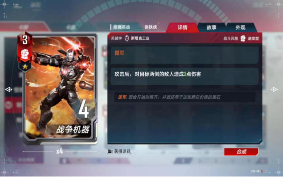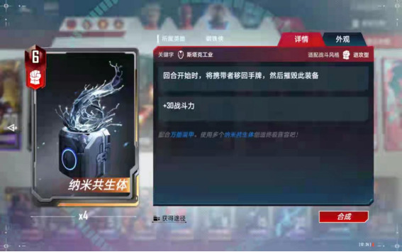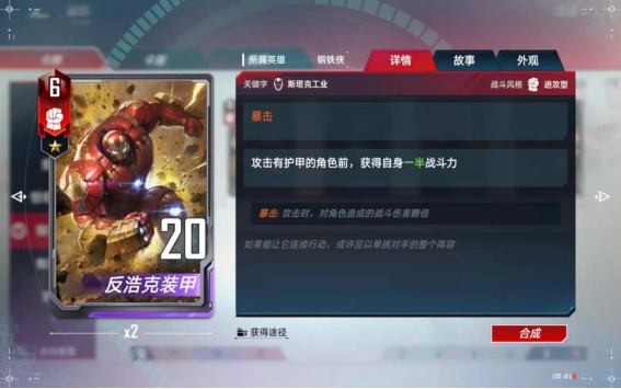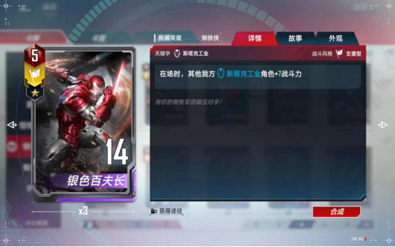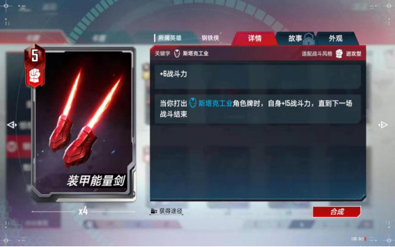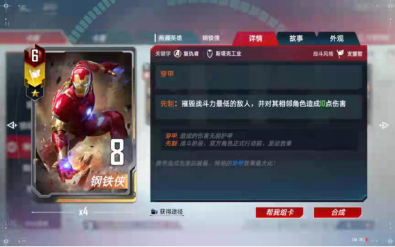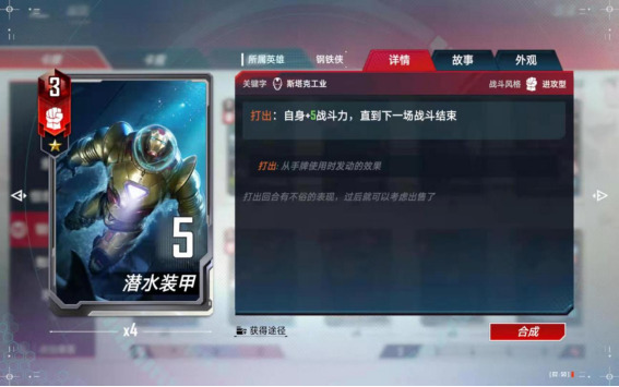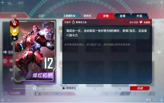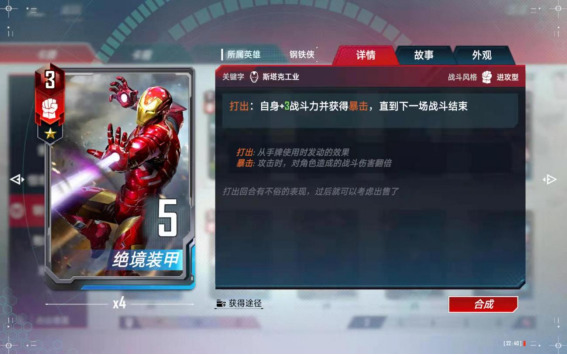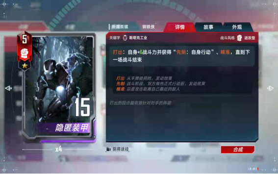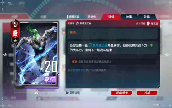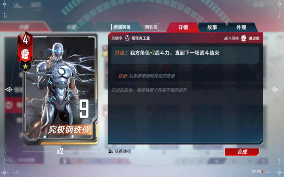 (7)、合成指南:想要玩【万能刺杀流】的,这张卡是核心之一,但是钢铁侠的尘肯定要优先留给“万能装甲”,这张卡还可以通过充值获赠,也可以通过合作模式(牌友模式)的尘购买得到,所以不建议合成。