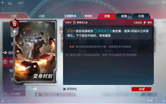 发现一张,你未拥有的“斯塔克工业”角色牌,使其+20战斗力并获得它。下个回合开始时,将其摧毁。