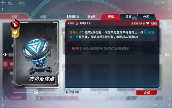特殊行动:造成2点伤害,你在本局游戏中,每曾打出一张“斯塔克工业”角色牌,就多造成2点伤害,每场战斗可以使用4次。