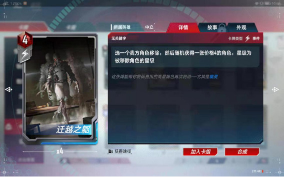 选一个我方角色移除,然后随机获得一张价格4的角色牌,星级为被移除角色的星级。