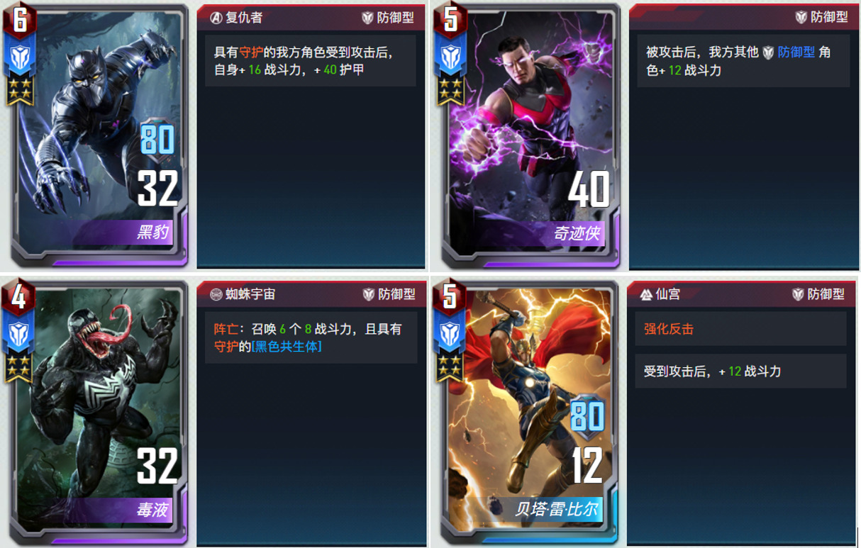 【毒液】:核心卡,至少2。需要佩戴【仙宫护盾】增加守护效果,毒液的优势在于可以阵亡后召唤共生体,他们都具有守护效果,星级越高召唤越多,如果最后阵亡则可以给黑豹多叠加几次战力、护甲;