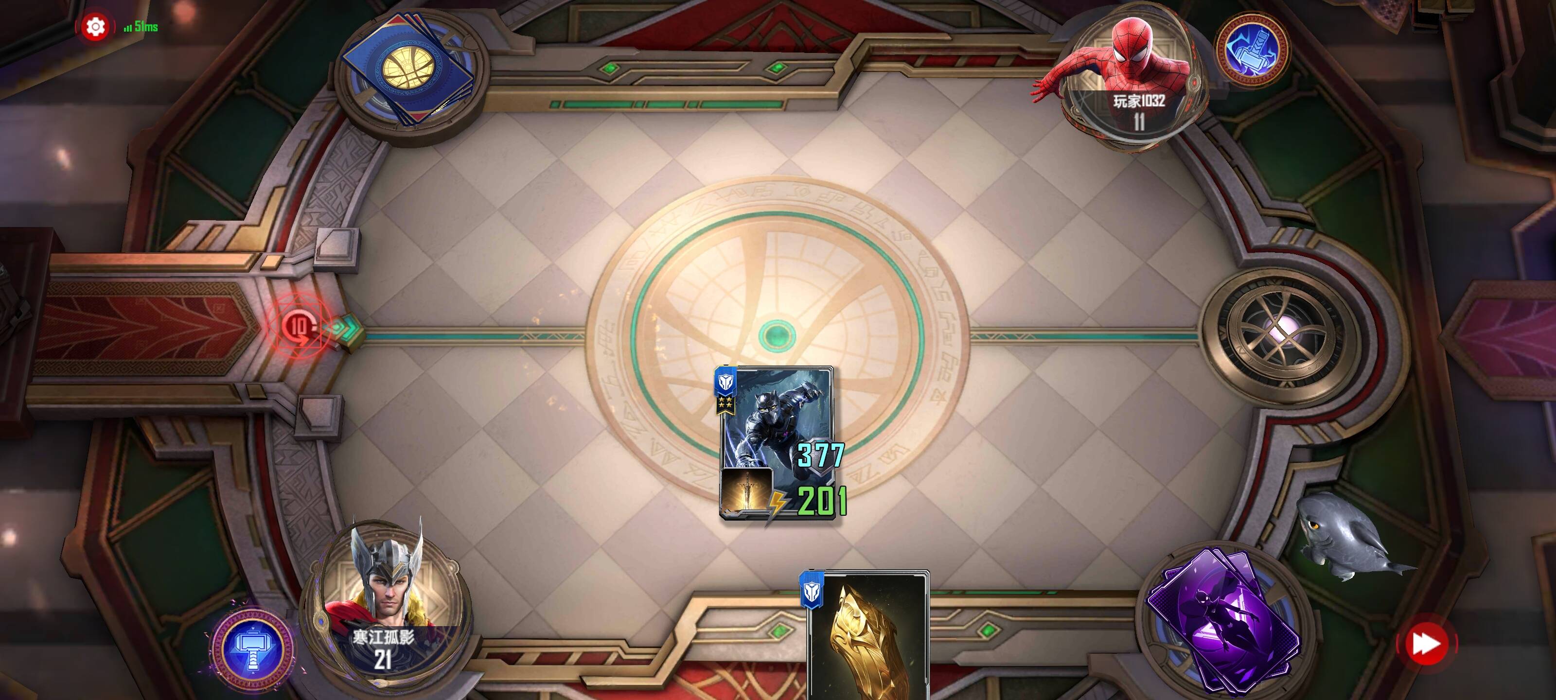 中期:使用【毒液迷镜魔】+【毒液】+【蛛丝】+【沙魔】+【守护之剑】的阵容过渡,沙魔(佩戴守护之剑)在中期很强势,但是到了后期强度就有点跟不上了,所以需要保证血量健康升6级找黑豹,这个过程中将低费牌置换成高费的阿比盖尔、奇迹侠、毒液、马面雷神等;
