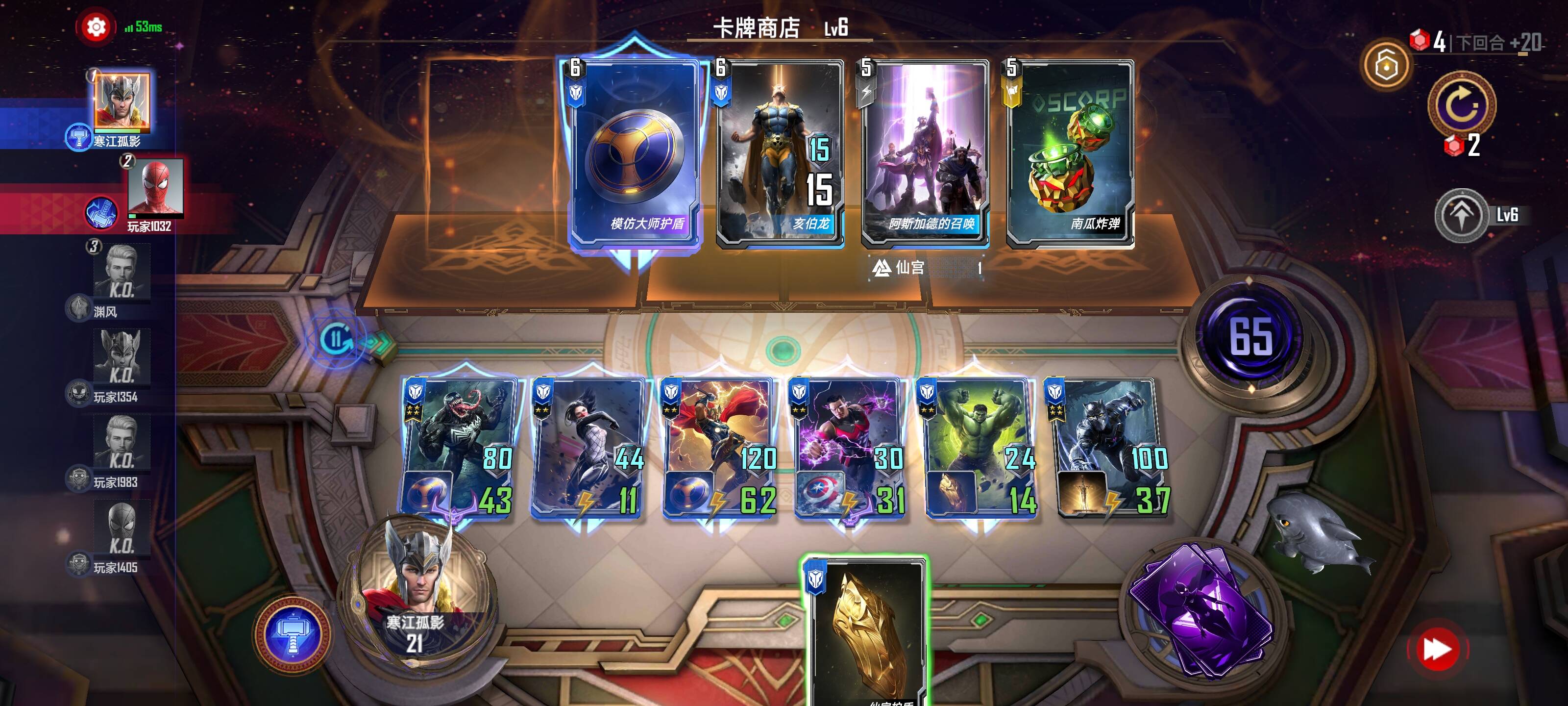 前期:起手优先用防御型卡牌,方便我们过渡到最终成型,常用的卡牌有【阿斯加德守卫军】、【毒液迷镜魔】、【迷境魔制服】、【角蝰】、【奥科耶】等;