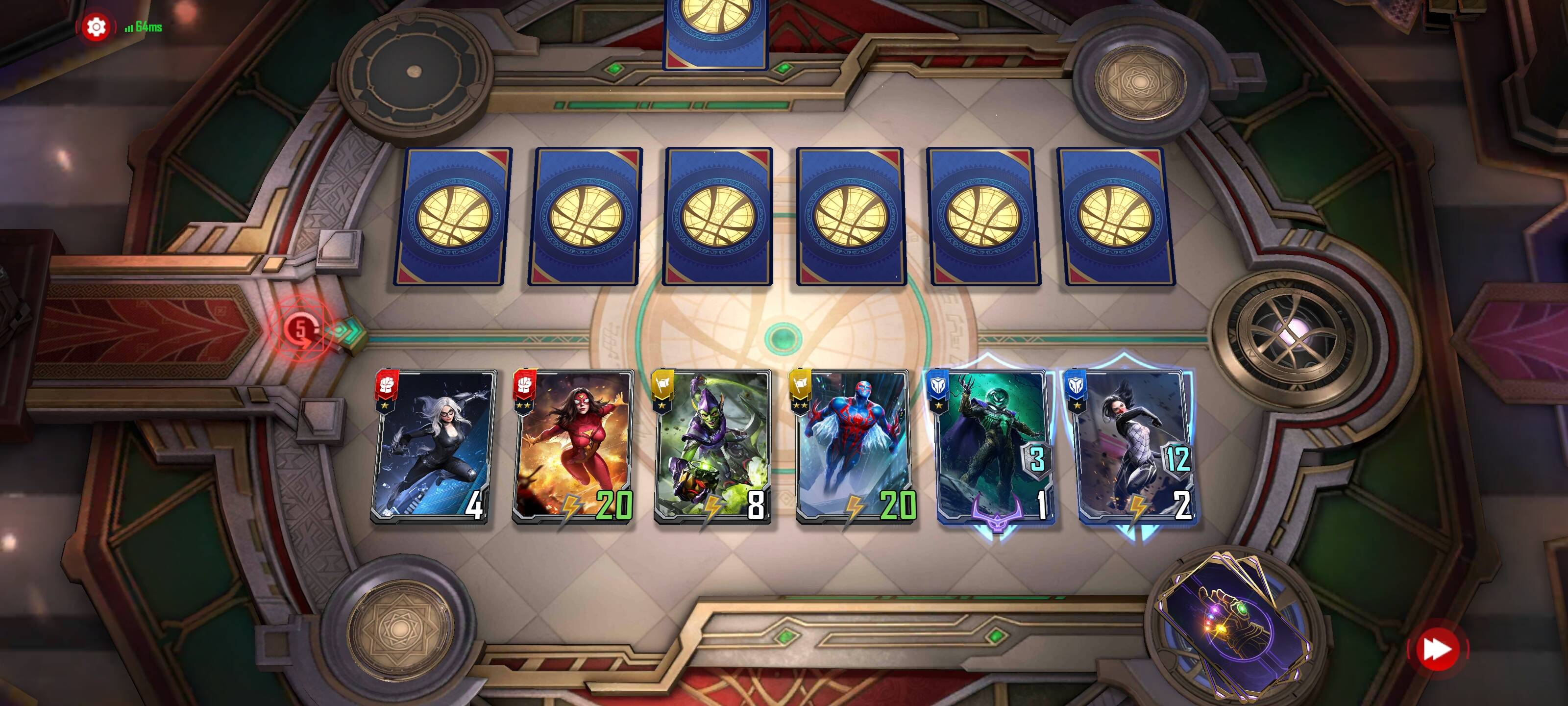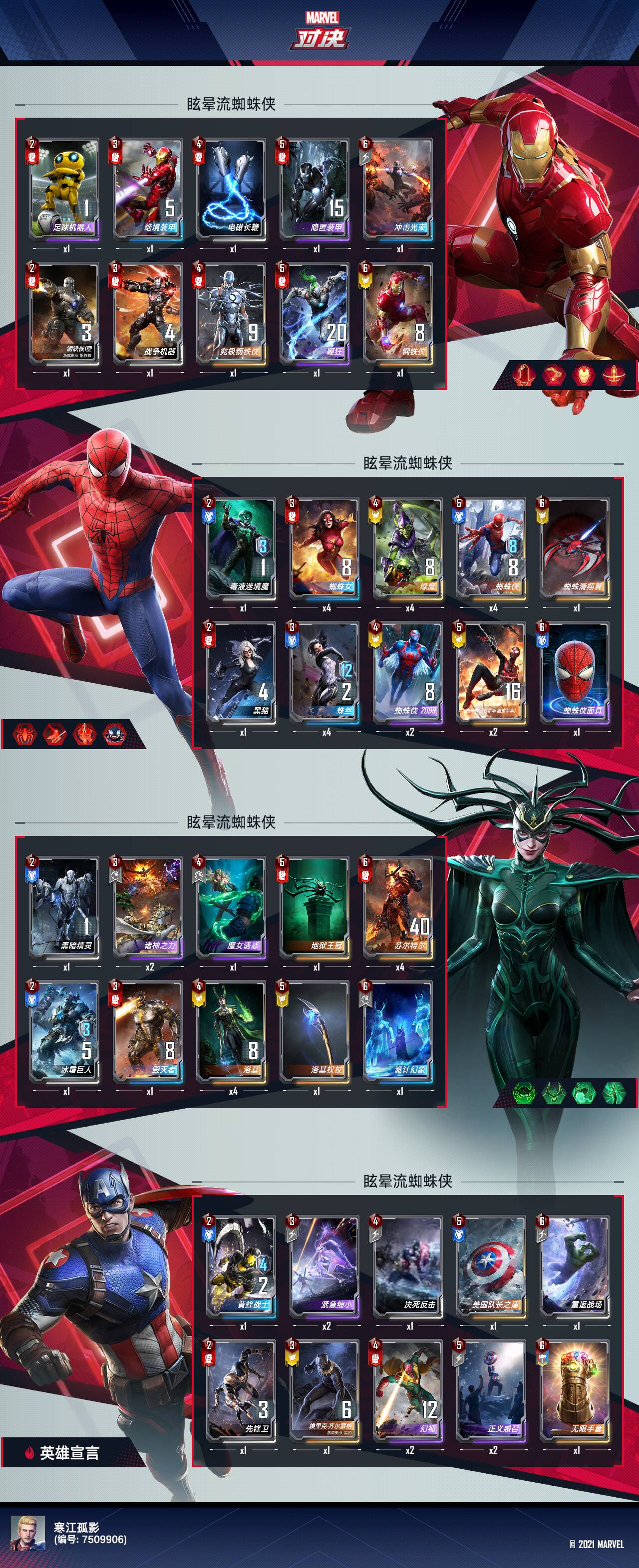 卡组思路:依靠绿魔buff进场的蜘蛛宇宙角色卡,给蜘蛛侠装备具有守护效果的护盾优先阵亡,然后蜘蛛女收割;如果有迈尔斯在场,攻击晕眩角色免疫反击伤害,生物交换方面有不小的优势。