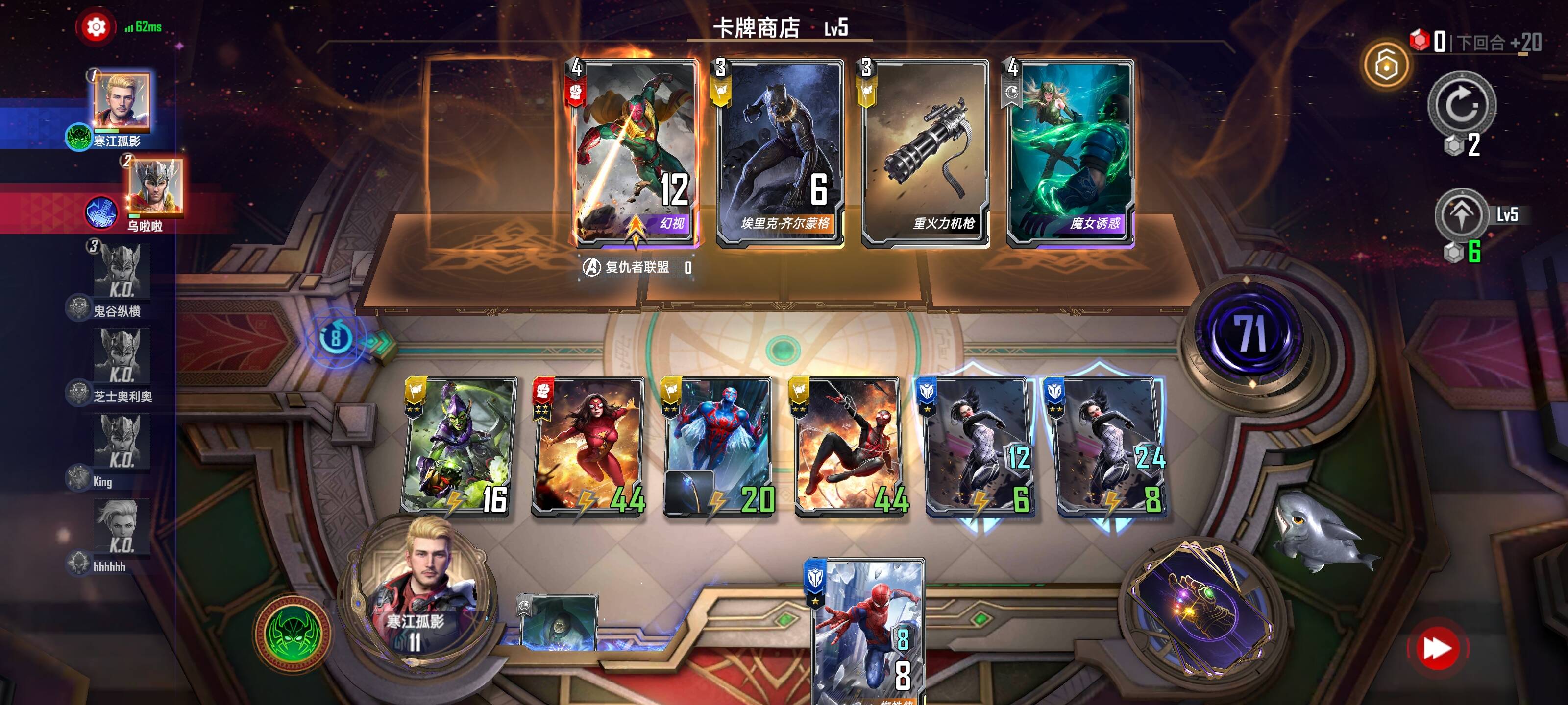【绿魔】:中期核心卡,至少2张。来的早可以触发蝴蝶效应,建立优势;后期(7回合之后)刷出来就没必要买了,可以放弃然后专心培养蜘蛛侠;