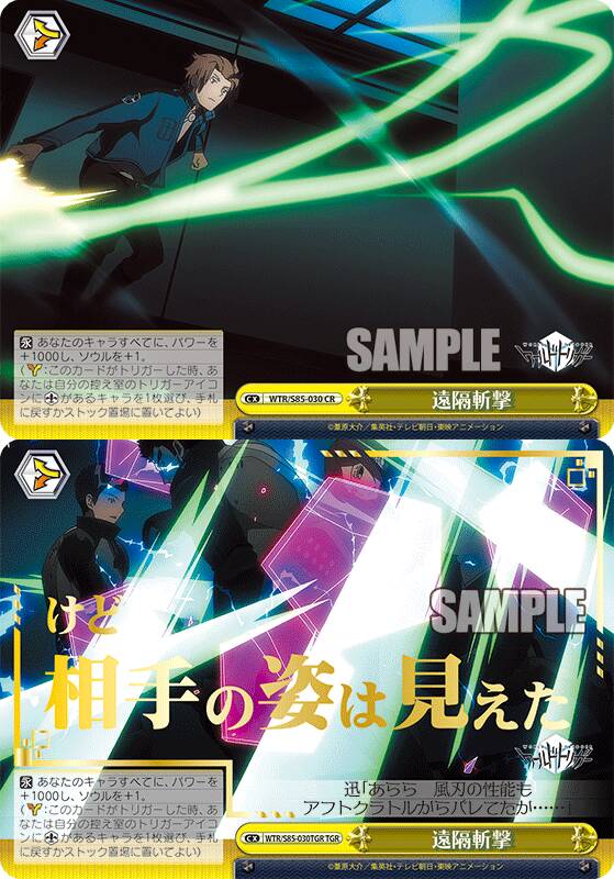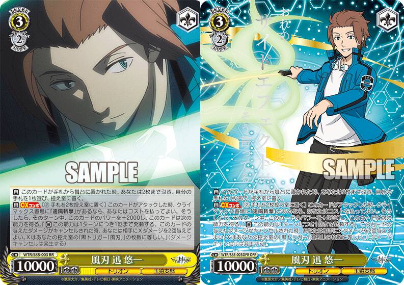 自:CX联动:[②将2张手牌放置到休息室]这张卡攻击时,CLIMAX区里有“遠隔斬撃”的话,你可以支付费用。支付了的话,这回合中,这张卡的战力+2000,这张卡获得以下能力。“自:这个能力1回合最多发动1次。这张卡造成的伤害被取消是,你可以对对手造成2次X伤害。X等于己方的休息室的‘黒トリガー「風刃」’的张数。”(会发生伤害取消)