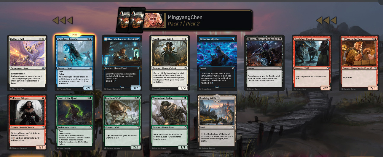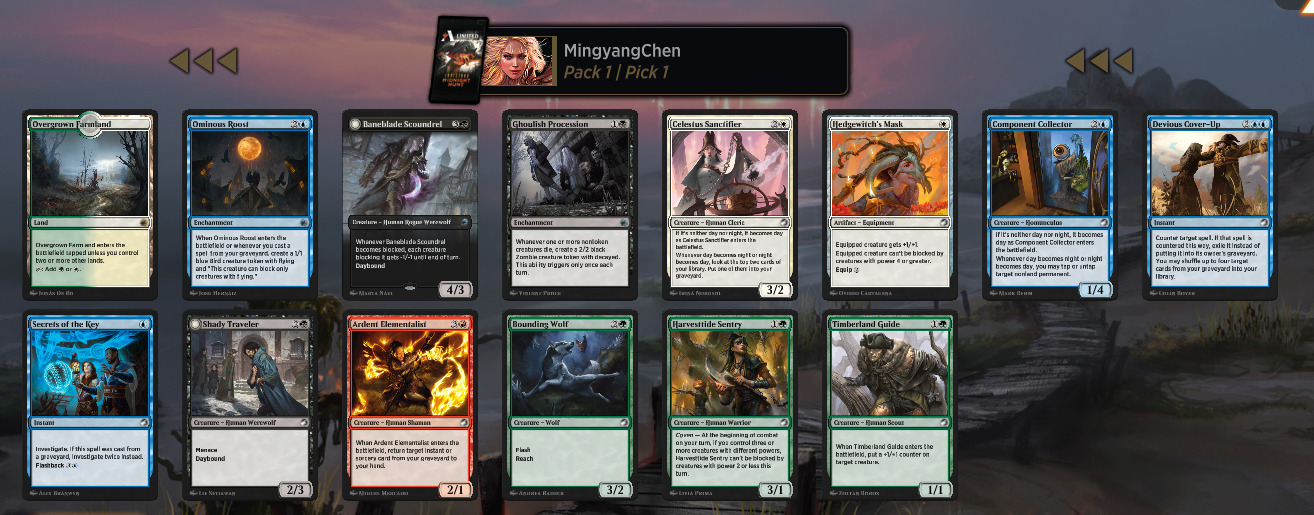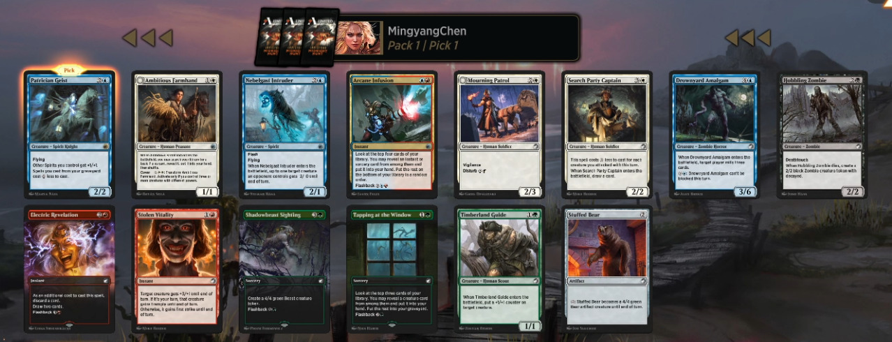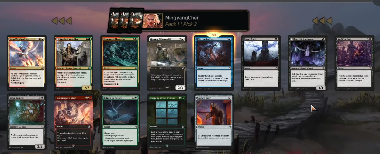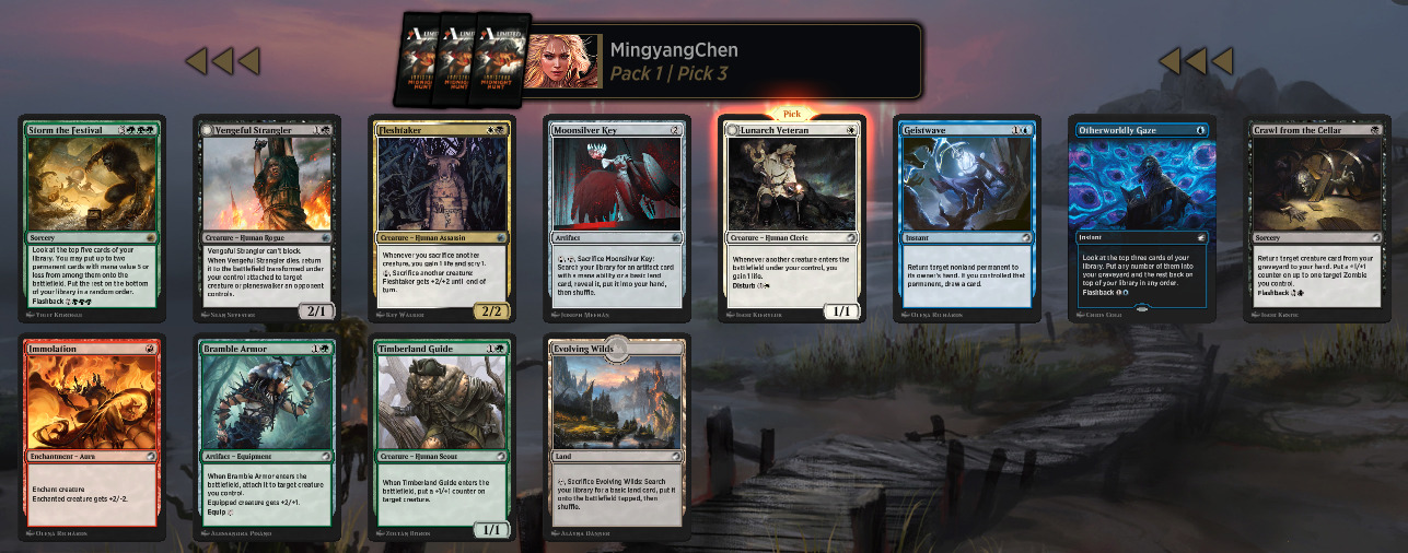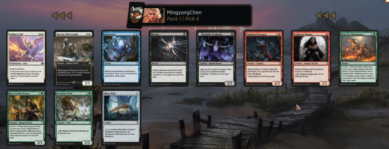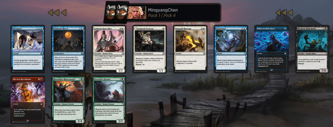 这包存在的问题是,好牌不少,但两张蓝牌都高于别的其他的“好牌”太多了,因此如果我们抓了其中一张蓝牌,下家大概率就会抓另一张。诚然我们希望和下家尽量别撞色,因此存在着扣下颜色和强度都较低的雄心农工和搜救队长、甚至是颜色差但无竞争者的亲睹黯影兽(这包没有其他强力绿牌)的说法,但还是像我前面说的那样,这些牌和蓝牌强度差距太大了,我为了传递信号不扣蓝牌的损失同时也过大,有些顾此失彼,因此兜兜转转我还是要从两张蓝牌里做选择。