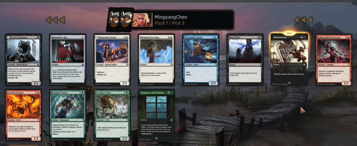 在大多数时候,鬼雾入侵灵都是个能换半张甚至一张牌的好生物,下限颇高,显贵游魂则可以成为一套白蓝惊扰的核心,让你的惊扰减一费,同时生物爬出来之后也大一圈,更有战略价值和上限。最终,我在1包1P的位置,还是选择这个更有上限的牌搏点梦想。诚然,我如果成功的进了白蓝,我这抓就很强,但如果是蓝黑什么的,它大概率就是个风龙兽了,但风龙兽也没那么不堪,总归还是能进主的。