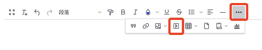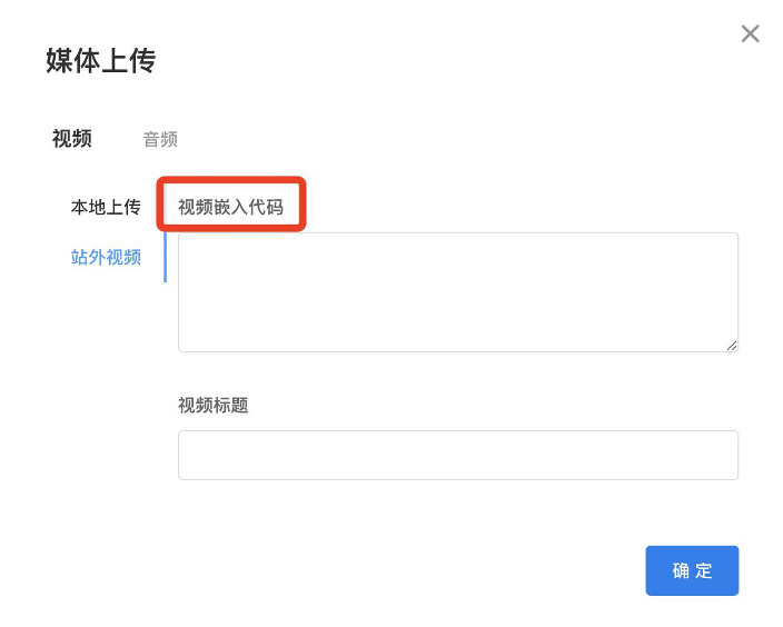 选择“站外视频”,粘贴“嵌入代码”——“嵌入代码”一般在点击站外视频的分享按钮后生成