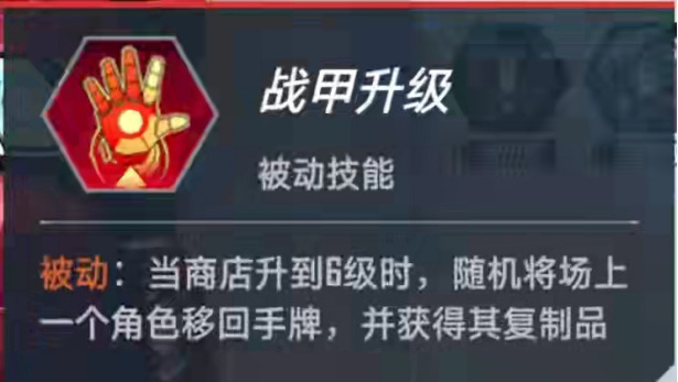 战甲升级这个技能本质上是个经济技能,尤其是场上有四星复 仇者的时候,升级到六级商店可以直接白赚20宝石,还可以获得一张高质量的复 仇者。非常好用,一般在场上单独有二星复 仇者的时候,就可以考虑使用本技能了,这样可以马上控制比赛锁血。