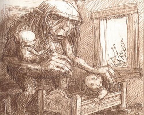 “šestonedielka”的孩子与“Mammuna”的孩子互换,被称为“换生灵”。Mammuna的孩子“换生灵”很明显——有点黑,很丑,不成比例。而且经常有残疾或疾病。它有一个巨大的腹部,一个异常小或大的头驼背,瘦弱的胳膊和腿,多毛的身体和长爪子。它的牙齿也开始过早地生长,看起来非常恐怖。它也害怕它的母亲,不想睡觉,它害怕噪音,而且非常贪吃。