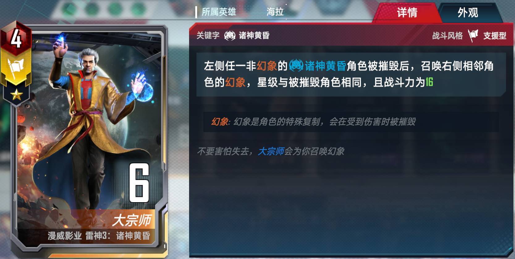 先科普一下大宗师的效果:左边非幻象的诸神黄昏工具人阵亡后,召唤大宗师右侧的角色幻象,幻象星级和诸神黄昏工具人星级相同,战斗力随大宗师星级成长,分别为16/32/64。