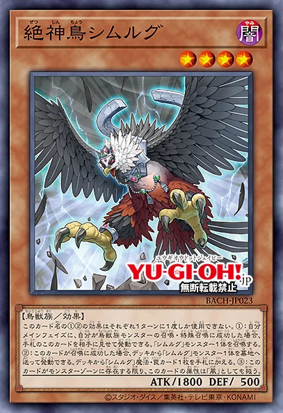 ①:自己主要阶段,自己对鸟兽族怪兽的召唤·特殊召唤成功的场合,把手卡的这张卡给对方出示才能发动。把1只「西摩格」怪兽召唤。