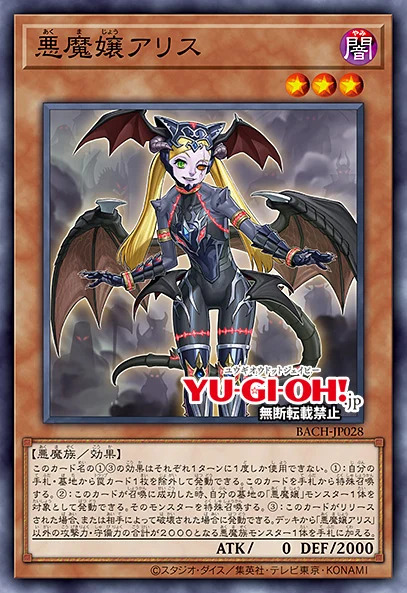 ③:这张卡被解放的场合或者被对方破坏的场合才能发动。从卡组把「悪魔嬢アリス」以外的1只攻击力·守备力合计是2000的恶魔族怪兽加入手卡。
