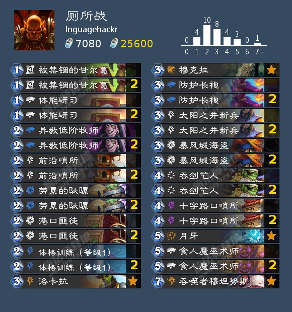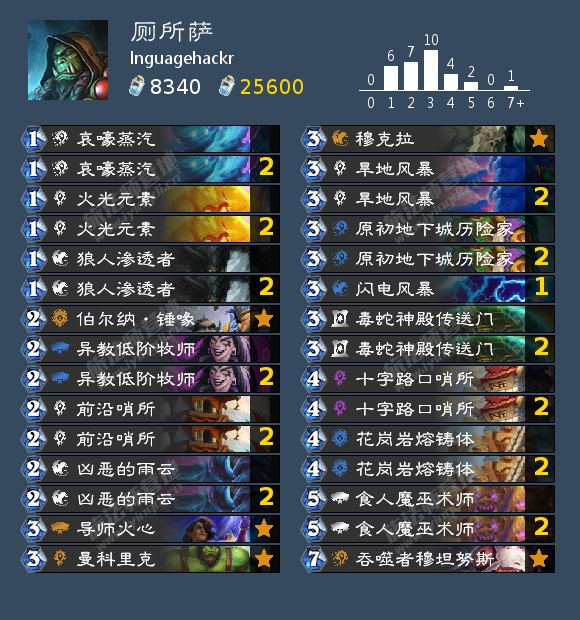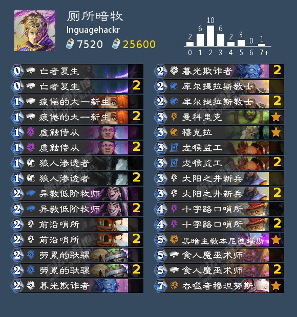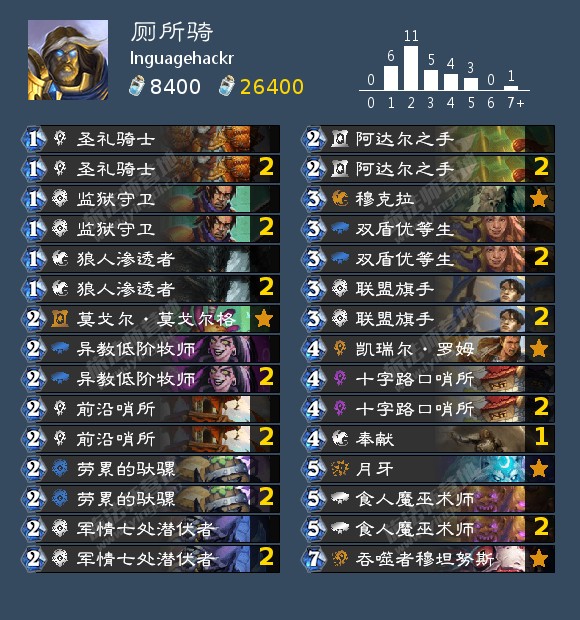 lnguagehackr在上周monsanto的基础上更上一层楼,除了2457外为了更稳健地抓瞎甚至还带了穆克拉这样的单卡,这样的优化还在一些莫名其妙细枝末节的地方,比如还拉满了太阳之井新兵这种能完美counter献祭光环的随从,从余裕术和余裕瞎也换成了进攻性更强的骑士和萨满。 环境里只有不和他同半区的且放飞自我准备退役的muzzy没有带瞎子外全带了瞎子。期待lnguagehackr这步优化后的险棋能取得成效(说不定还能看到他把这个思路鼻祖的monsanto拉下水的这一幕)。