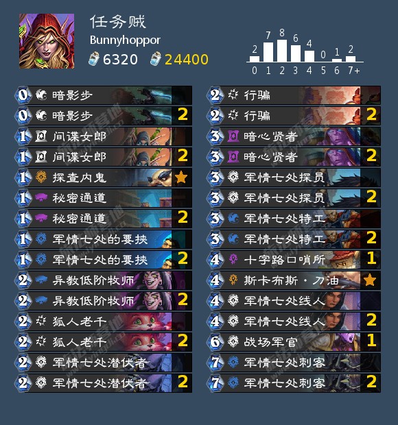 Bunnyhoppor的阵容有些太别具一格了,公认的两大巨头吸血瞎和锁喉贼他一套没带,在贼位置上反而是带了任务贼还带了一张4费哨所,还带了圣契骑,那么他的目标应该是吸血瞎了,但猎人有些让人摸不着头脑,超生德据说应对瞎子的能力并不差,倒是他这几套牌应对术士的能力都挺不错的,任务贼的小工具和军情七处刺客处理大哥很效率,圣契骑也是出色的应对术士的卡组,是接近关双的思路。