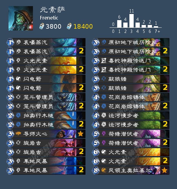 Frenetic也是和bunny一样没带贼瞎,接近关瞎的阵容,但他的选择则是元素萨和术士,猎霸居然放弃了他忠实的猎人(这或许能作为带猎人并非针对瞎子的佐证),元素萨在我看来是能让瞎子比较难受的卡组,但是逻辑很奇怪,他的优势是怪难吃眼棱,数量也不多,AOE也不好使,往往需要依赖复数个组件来处理场面。
