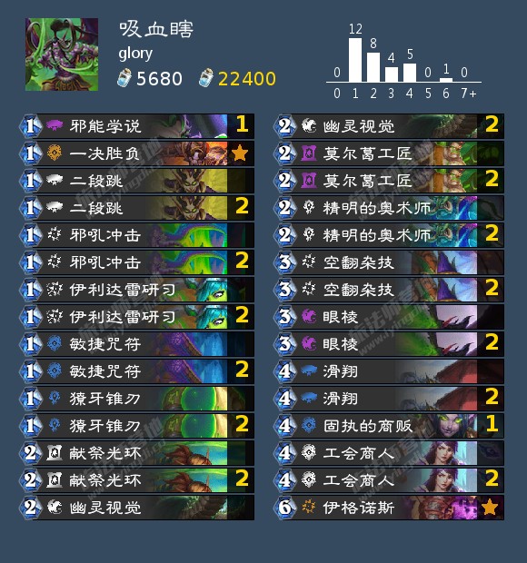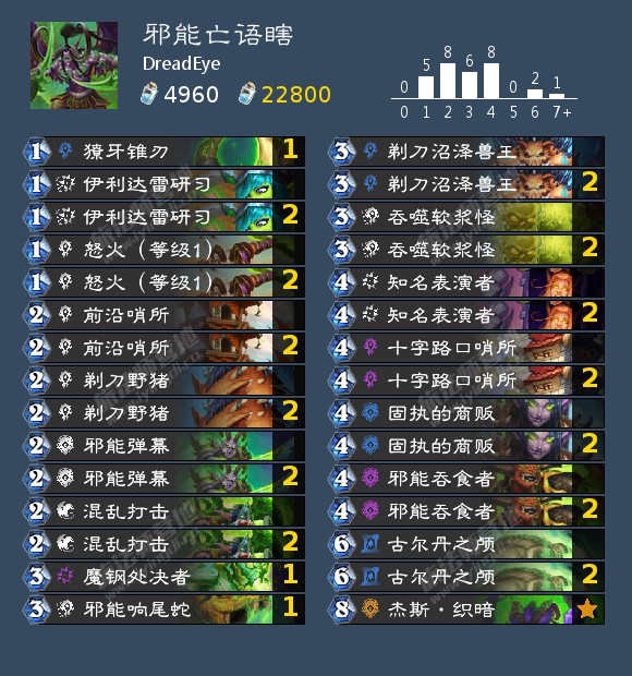 DreadEye的这套瞎子也是有些让人看不懂的构筑,没带贼瞎一般有所图的目标对局并没有很好的体现,或许也是应对术士的处理,毕竟他还带了法师,但我还是倾向于关瞎子,法师应对瞎子其实没有想象中那么差,也可能是和bunny一样的关双思路,给出更多的余地给其他对局的产物。