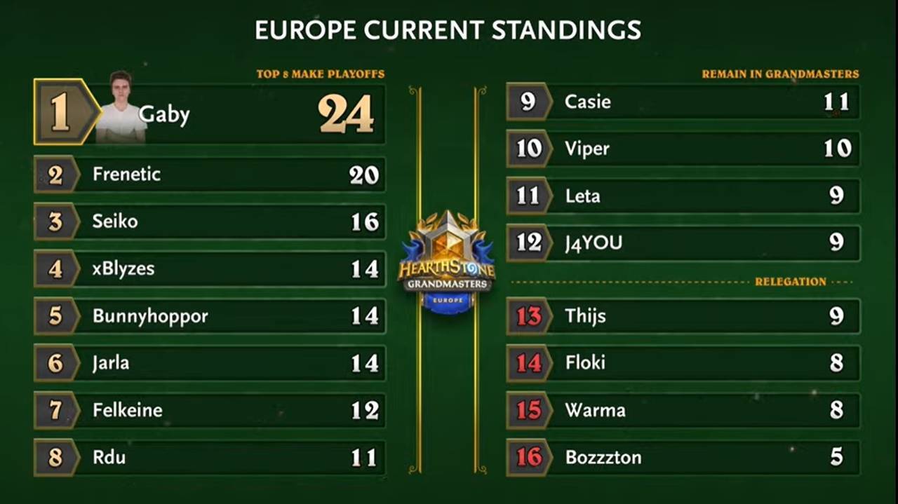 本赛季GM步入了季后赛阶段了,也是本赛季最后一篇卡组分析了,在此感谢大家的支持与阅读。3个服务器各8名选手将一起争夺各自赛区今年最后一张通往总决赛的门票,令人欣喜的是第一赛季的冠军得主在第二赛季常规赛也有惊艳的表现,亚服的Posesi以22分占据了常规赛榜首,欧服的Frenetic和美服Nalguidan也都占据了常规赛第二的成绩,虽然这样的成绩这离不开冠军5分的加持,但即便去掉这个积分再次排位也是名列前茅,这意味着他们依旧有着出色的竞技状态,总决赛的水准值得期待。说回季后赛名单,亚服几乎是日本众的天下,季后赛名单上除了Posesi外还有上届冠军glory和积分第二的阿童木(没有Posesi积分加持他就是真正意义上的第一),不论从结果和过程(屡屡创新的牌表,比如KOF法师带香料面包师,阿童木在补丁前引领的任务brute吸血瞎)来看,日本众都说得上是具有世界一流水平的团体。而欧服这边则是有相当多触底反弹的选手,不说后半赛季越来越老道的Seiko和终于不那么倒霉的Bunny,最典型的当属Felkeine,即便他夺冠那周还是菜得离谱,让人不堪入目,镜头前的表情包更是让人觉得他是一个活宝,但在此之后却操作意外地变得相当出色,有触底反弹自然也有高开低走,Viper在第一周还拿到亚军仅仅憾负与技运兼具的无敌Gaby但在后半段却屡屡不进8强,仅仅离季后赛门票差了1分(还是2分?)不免让人有些唏嘘。美服的积分则是相当的“血腥”,从第5的语言哥到第9的无手哥全是13分(如果加上Nalguidan18分去掉5分的13分的话还能再多上一位,这实在是太13了),第4的Fled也才14分,美服说得上是中段差距最小的赛区了。