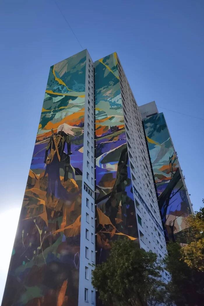 这幅壁画是在一座26层楼的建筑上完成的,作品高度约为78米,面积约为2000平方米,该作是目前波兰最大的壁画,也是世界最大《巫师》艺术作品。