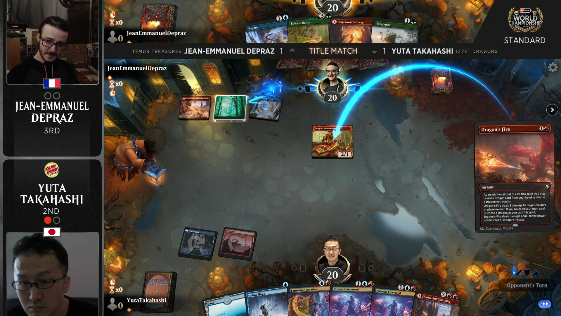 另一边,法国队长Jean-Emmanuel Depraz 迎战高桥优太,虽然法国队长为红蓝额外回合做了充足的准备,主牌加入了两个失效来针对,但高桥优太的跨金桥巨龙和一堆低费去除表示爷不吃这套,铁木尔基本都是捏着失效被巨龙踢了两脚,最后只得失效了个无所谓的咒语后投降。