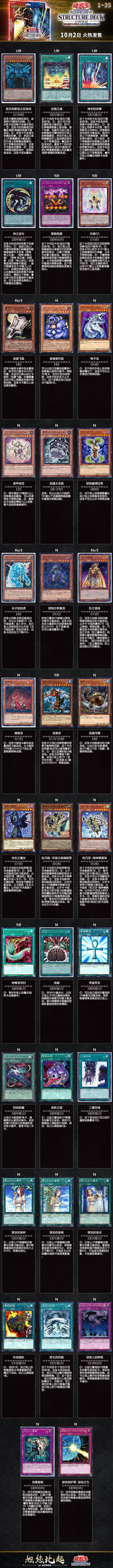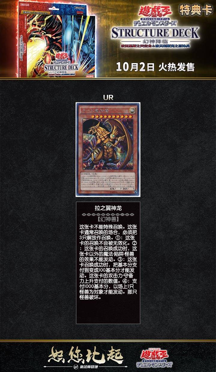 2021年10月2日 主题卡组套组 幻神降临:欧西里斯之天空龙/欧贝利斯克之巨神兵(EGS1+EGO1)内容:2副 构筑牌组(1副40张,含有UR(金闪稀有卡)4张、SR(面闪稀有卡)3张、N(普卡) 33张)3张 特典卡(UR「拉之翼神龙」、SR 2张)2张 特制场地纸(单人使用)