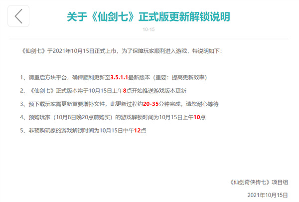 为了保障玩家顺利进入游戏,官方项目组今日发布“关于《仙剑七》正式版更新解锁说明”,说明如下: