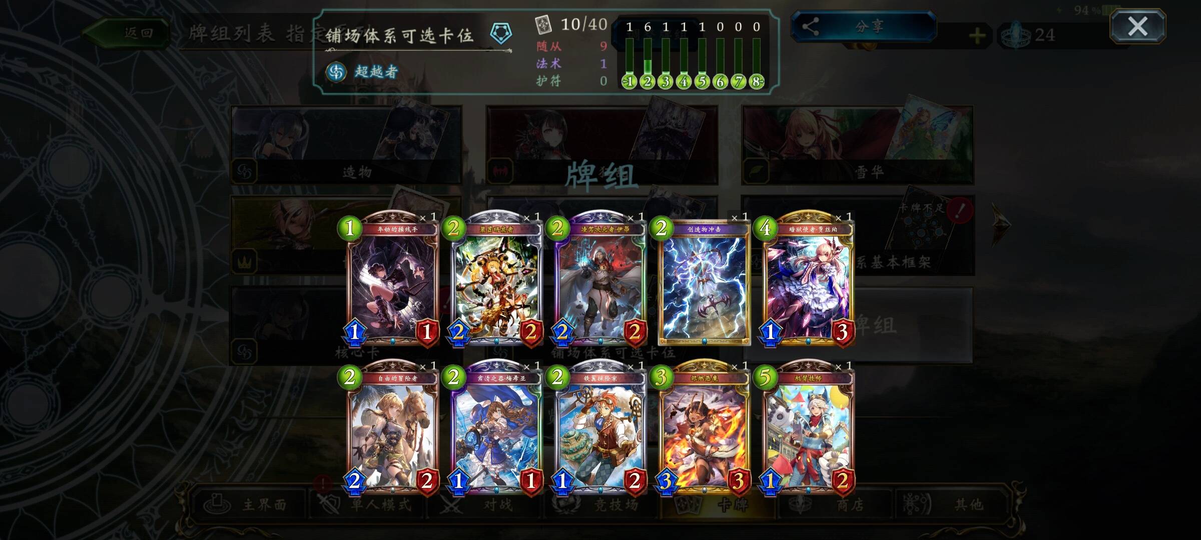 妖精有斩击妖、华哥妖、进化奶妖等数种思路,基本都是小优。依通用策略留牌即可。由于华哥妖和进化奶妖有前期解场,可以考虑先卖其他卡来保证裁线和大师收益最大化。妖精奶量有限,难以处理前期人偶展开,缺乏防范宽容手段,不足为惧。打斩击妖注意防范斩击爆发直伤,主要是关注回手的游侠数量,存的萤火数。